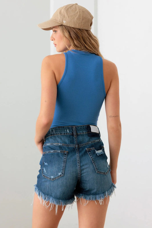 Blue Mid Waist Side Slit Destroyed Denim Shorts