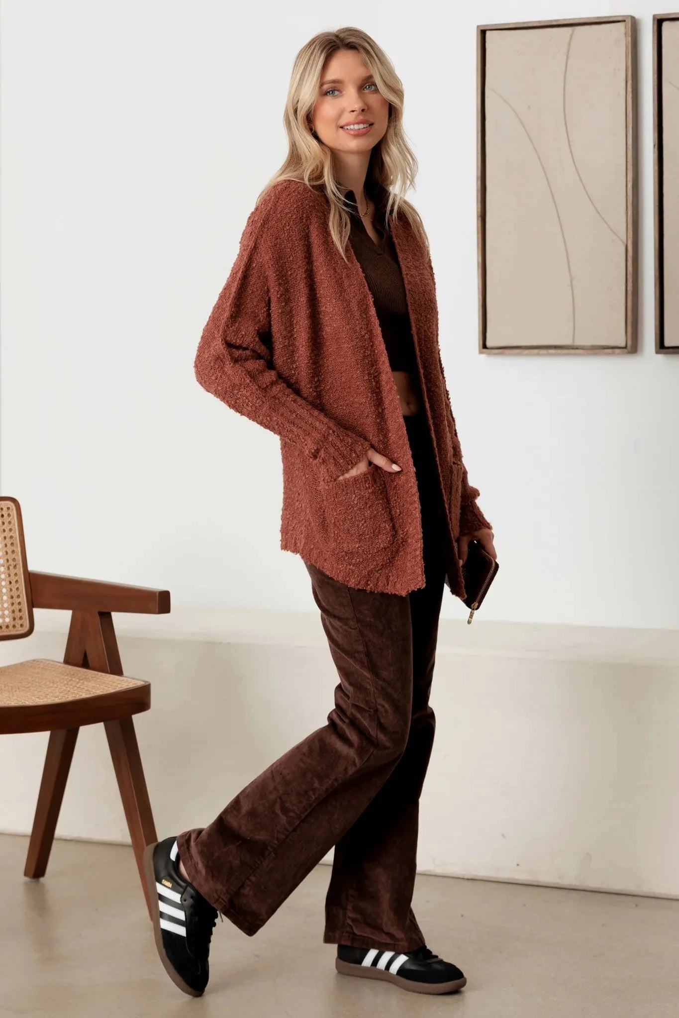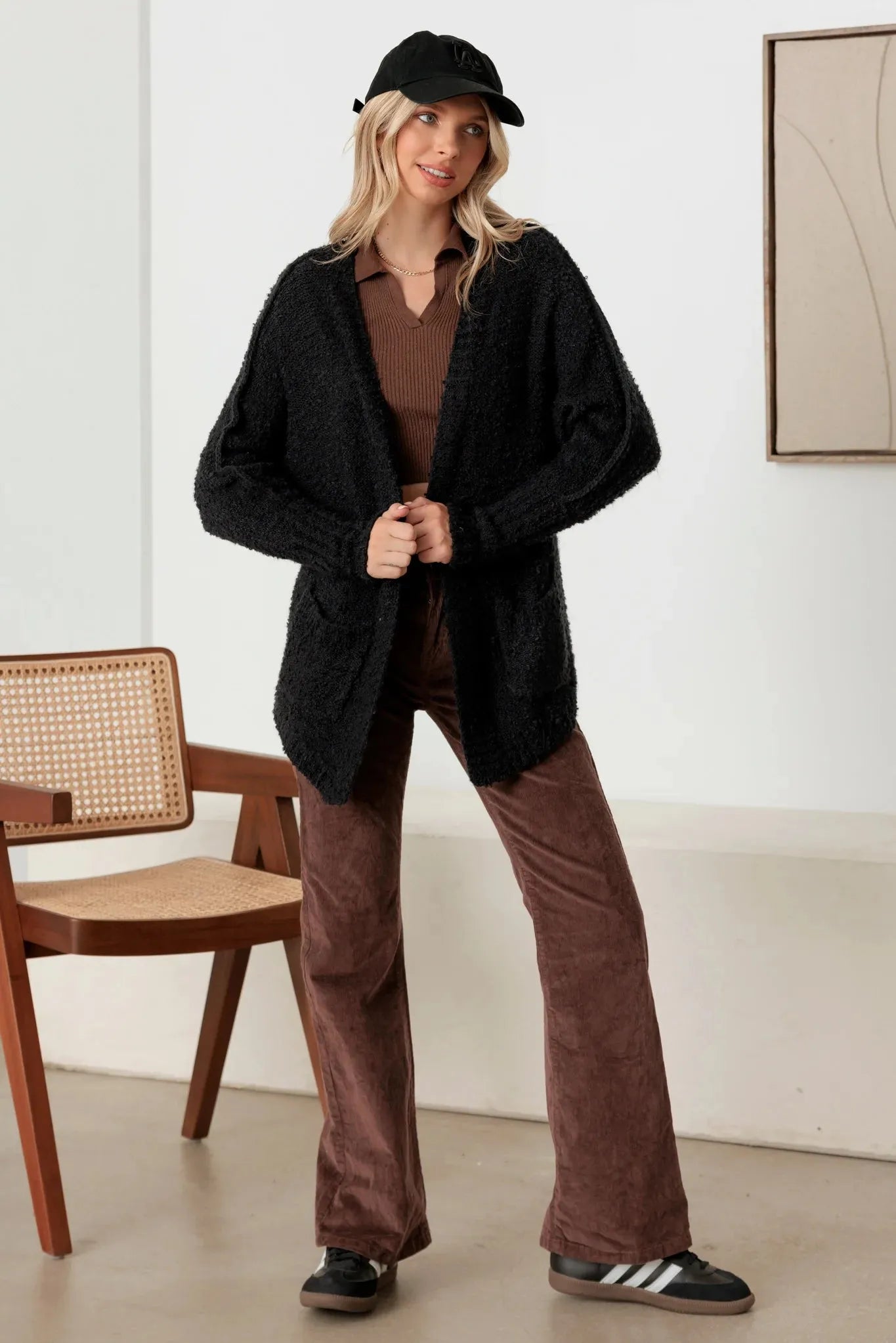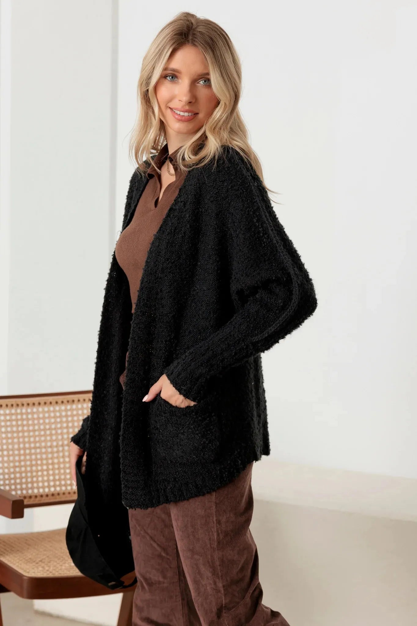 This luxurious open front cardigan is crafted from a textured knit fabric, delivering both comfort and sophistication. Complete with two pockets for added convenience, it is the perfect addition to any wardrobe. Elevate your style and stay cozy with this Knit Textured Two Pocket Open Front Cardigan.