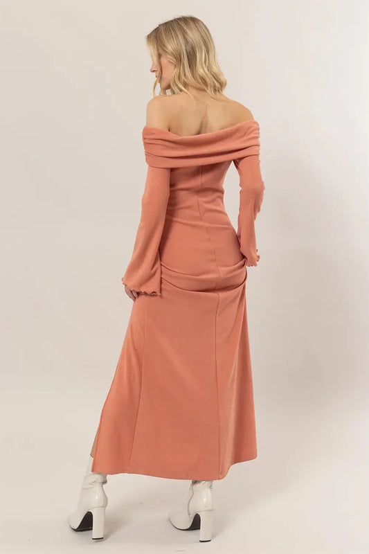 Coral Off Shoulder Ribbed Knit Long Sleeve Boutique Maxi DressVendor:HYFVE