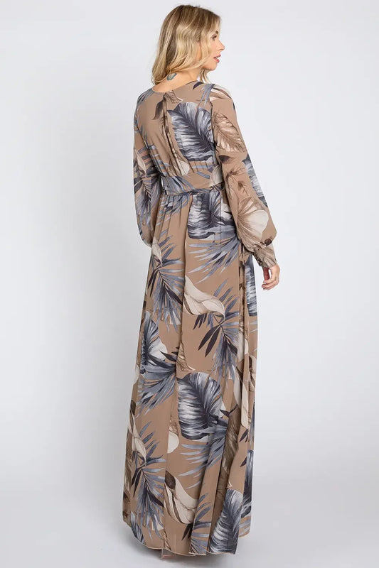 Tropical Palm Print Long Sleeve Chiffon Wrap Boutique Resort Maxi DressVendor:One The Land