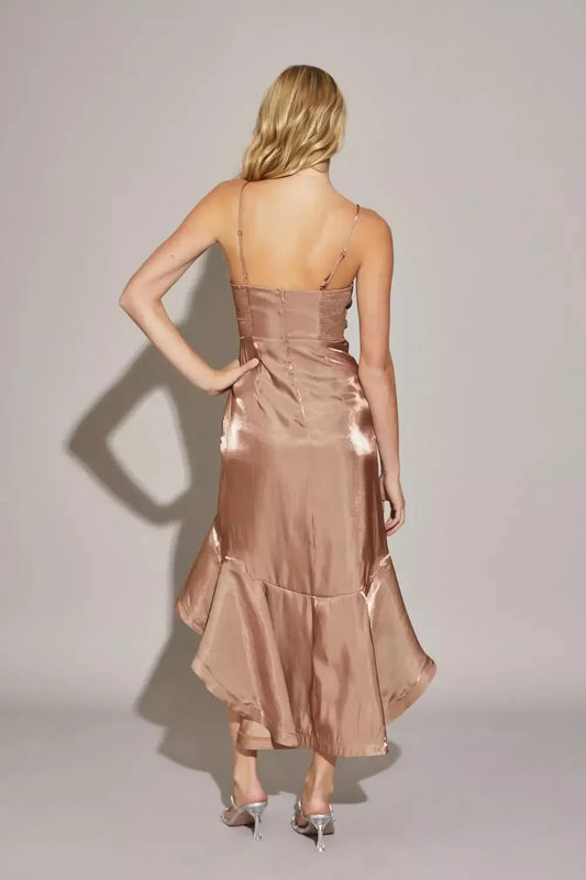 Satin Asymmetric Ruffle Wrap High Low Midi DressVendor:Mustard Seed