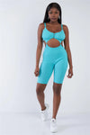 Aqua Blue Front Zipper V-Neck Sporty Chic Biker Romper /3-2-1