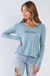 🖤 Item Features: Solid arona blue, lightweight jersey knit, long sleeve, v-neck, "strength" graphic text print, slight hi-lo hem, accent patch, unlined, stretchy, casual, laidback, spring.