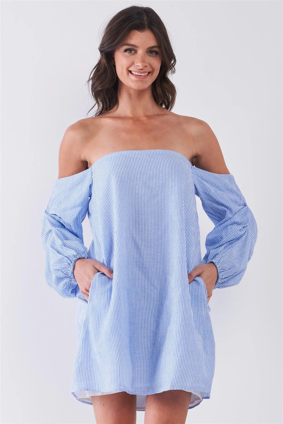 🖤Item Features: Baby blue & white, stripe print, elasticized off-the-shoulder, strapless, gathered balloon sleeve with stretchy cuff, two side pockets, unlined, non-sheer, non-stretch, mini length, shirt type dress, casual, breathable, loose fitting, sexy, vacation vibes, spring/summer collection