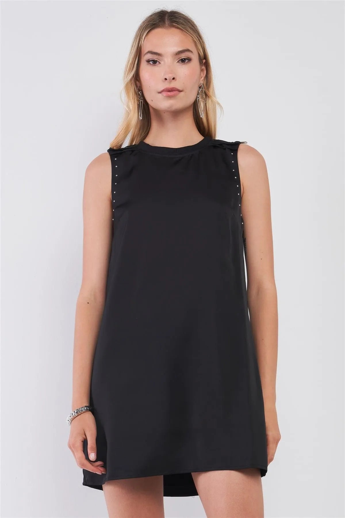 Black Sleeveless Crew Neck Silver Beaded Trim Zipper Shoulder Detail Relaxed Mini Dress
