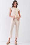Beige Sleeveless Stylized Button-Down Front Detail Self-Tie Waist Capri Cotton Jumpsuit /3-2-1