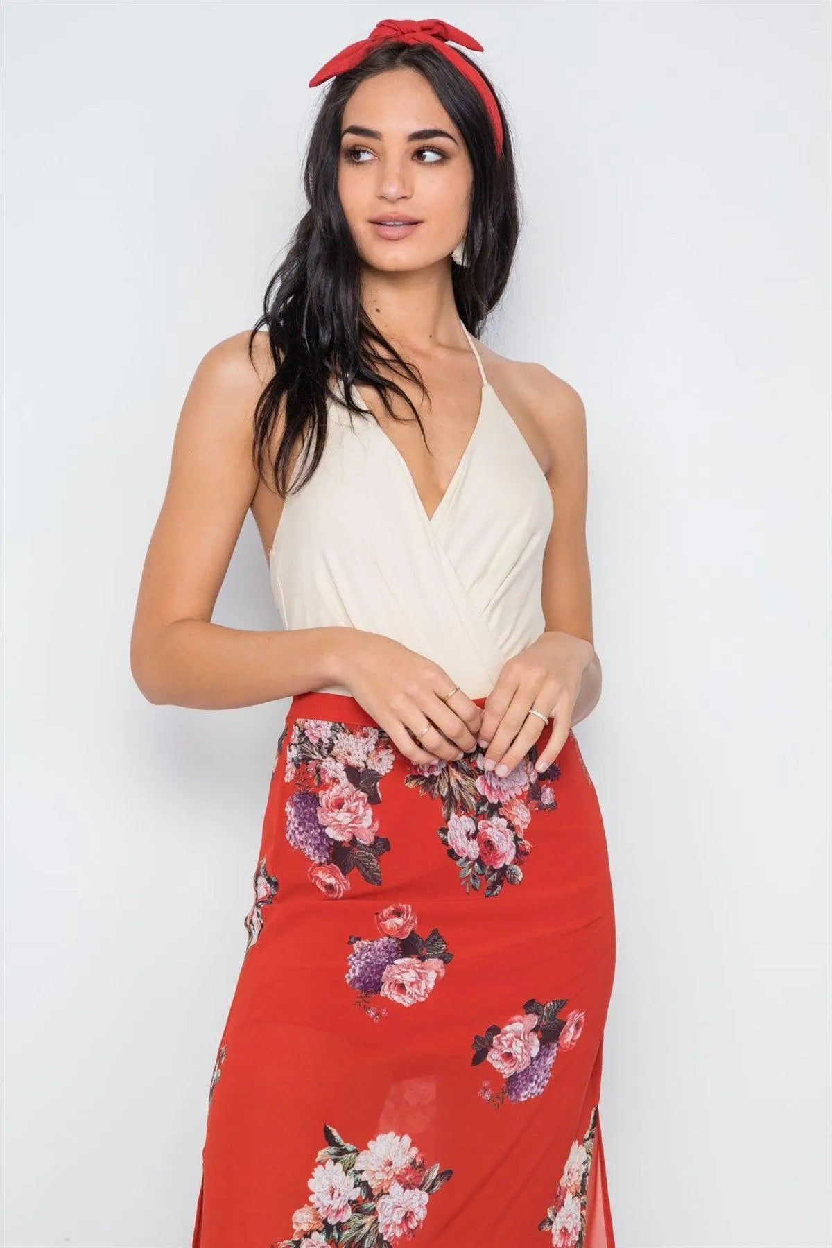 Boldly Blooming Black Floral Halter Neck Open Back Deep V Wholesale BodysuitVendor:Lulus