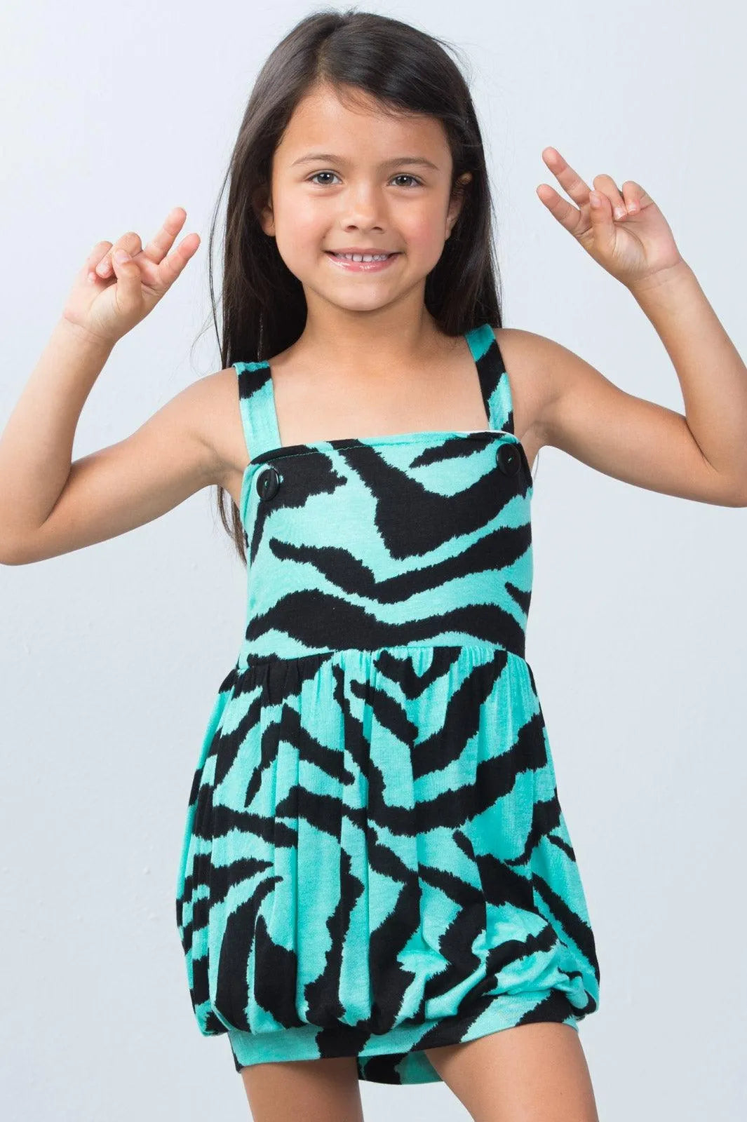 Girls Top features: sleeveless, two decorative button at front, stretchy, allover animal print, relaxed fit, tunic style. Model is 6 years old and wearing size 8Item measurements: Length: 18", Bust: 20"
