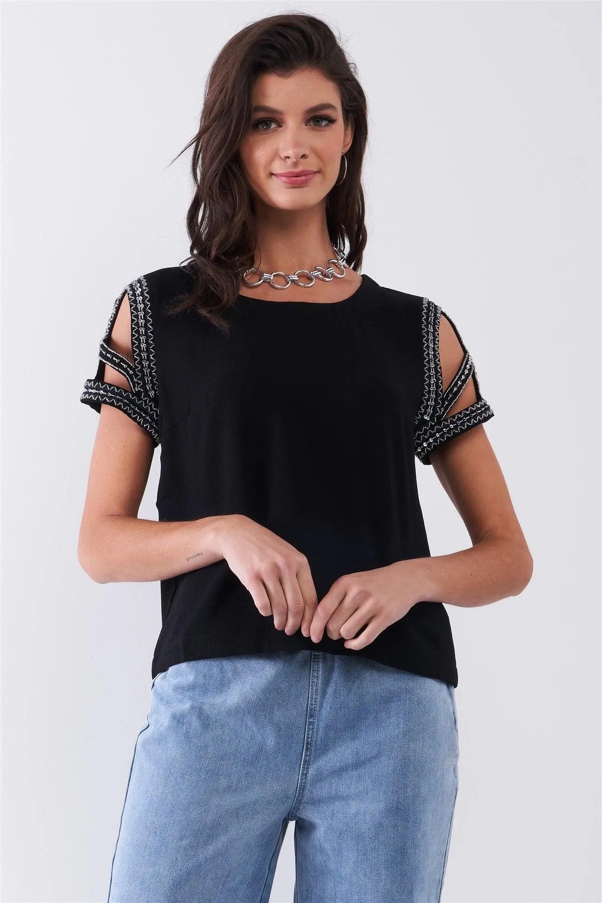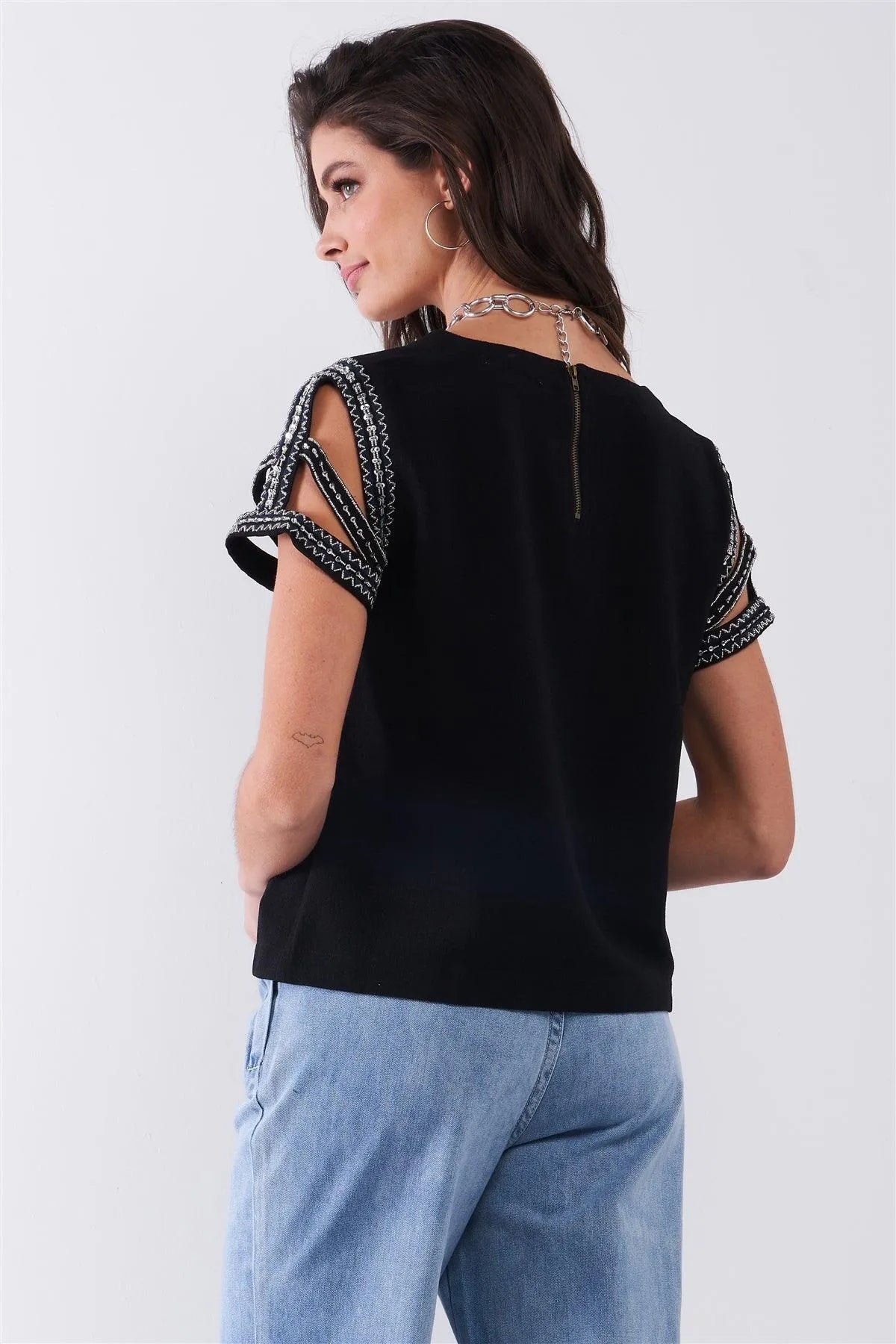Black Round Neck Glittery Bead Embroidery Cut-Out Sleeve Detail Relaxed Top /1-2-2-1