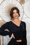 🖤 Item features: Black, solid color, V-neckline with bow detail, long juliette sleeves with smoked elastic ruffle trim details, smoked elastic ruffle trim hem, cropped length, relaxed fit, fitted waist, unlined, non-stretchy, chic, girlish, trendy, elegant, must have