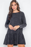 Dress features: long sleeves, round ribbed neck, back keyhole with self tie closure, shirred hem, unlined, relaxed fitModel is 5'9 wearing a size Small (Waist: 24", Bust: 32A, Hips: 34")Size Small Item Measurements: Length: 32", Bust: 38", Sleeves: 24"True to size