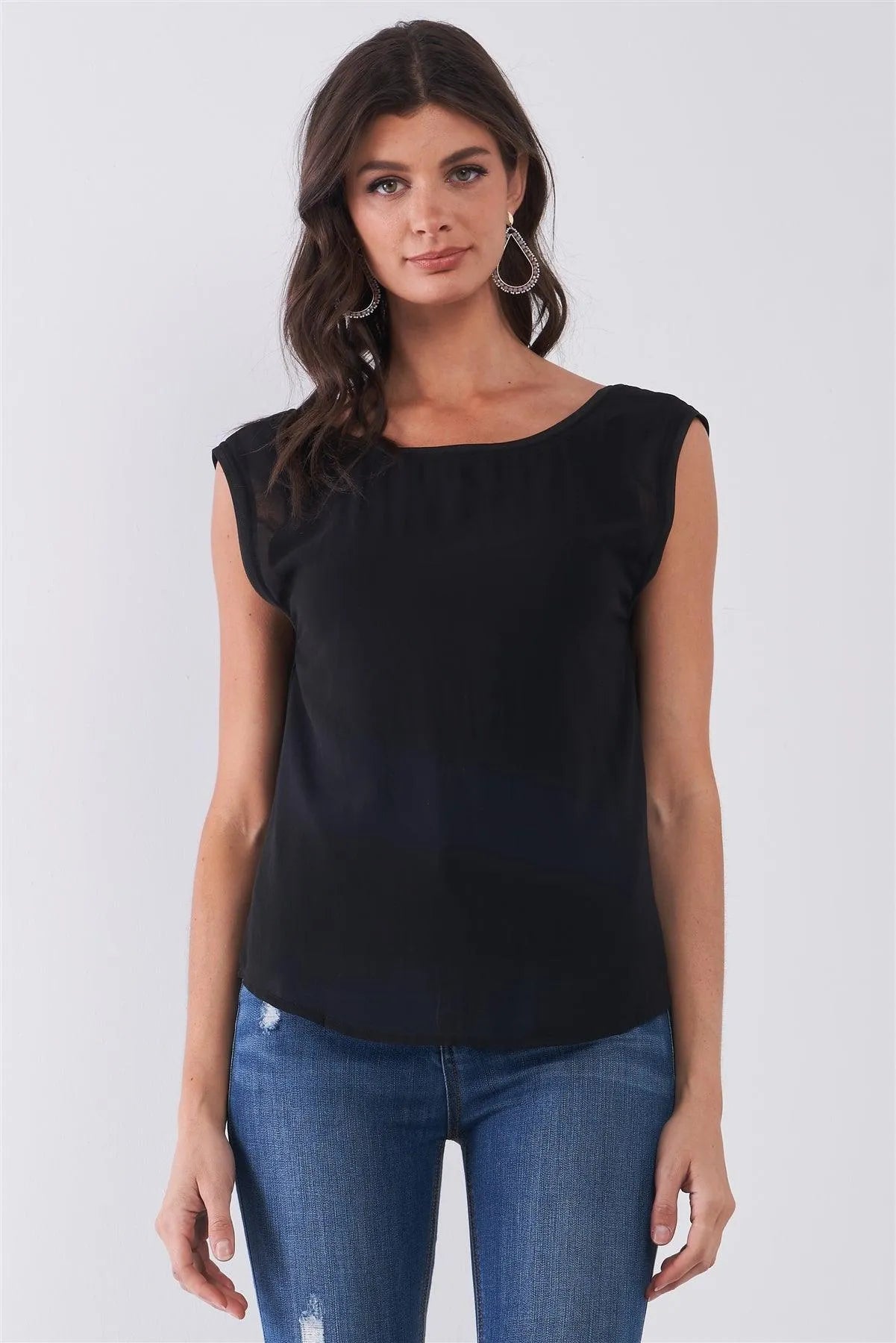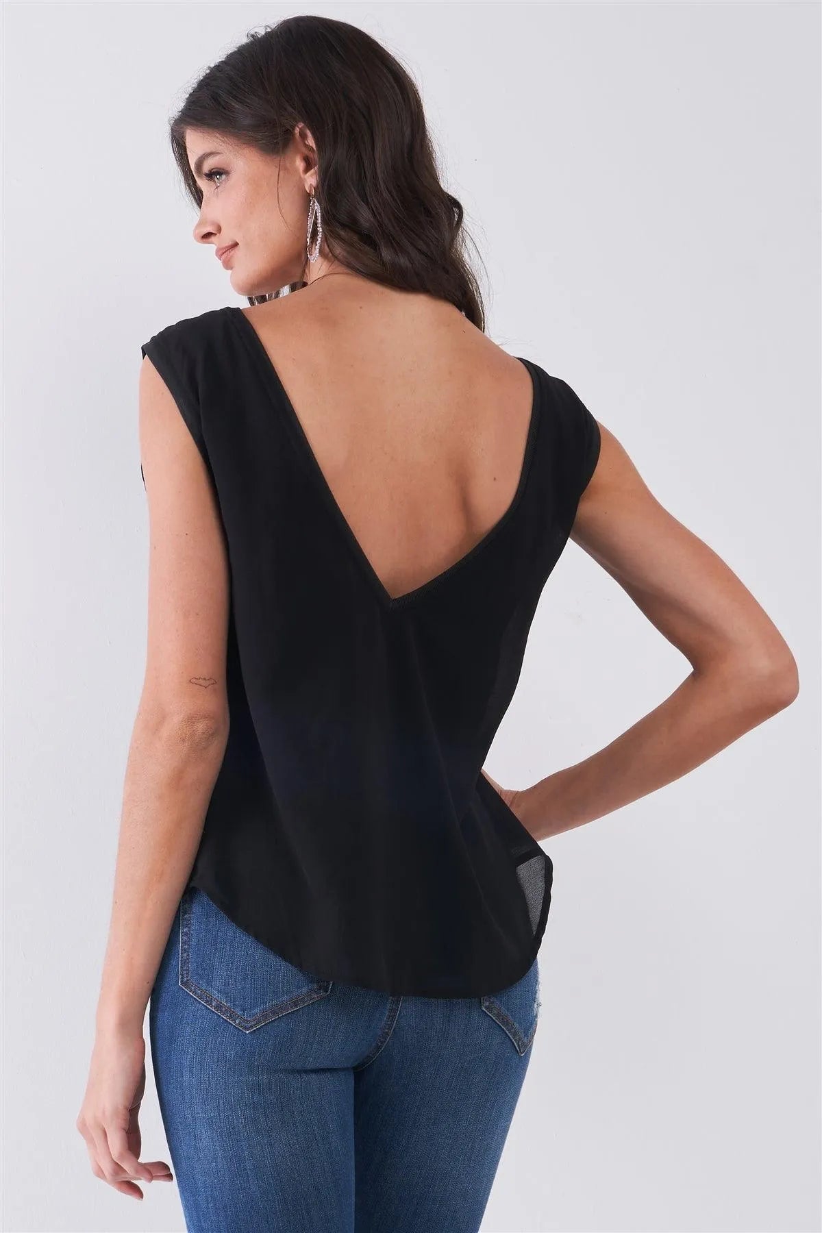 Black Sheer Chiffon Sleeveless V-Back Detail Relaxed Lined Top /1-2-2-1