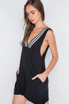 Romper features: sleeveless, deep V-neck and backline, side pockets, contrast stripe neck, relaxed silhouette, unlinedModel is 5'9 and wearing a Small (Waist: 25", Bust: 34B", Hips: 35")Small Items Measurements: Length: 31.5", Bust: 34"True to sizeAvailable in Olive and Charcoal