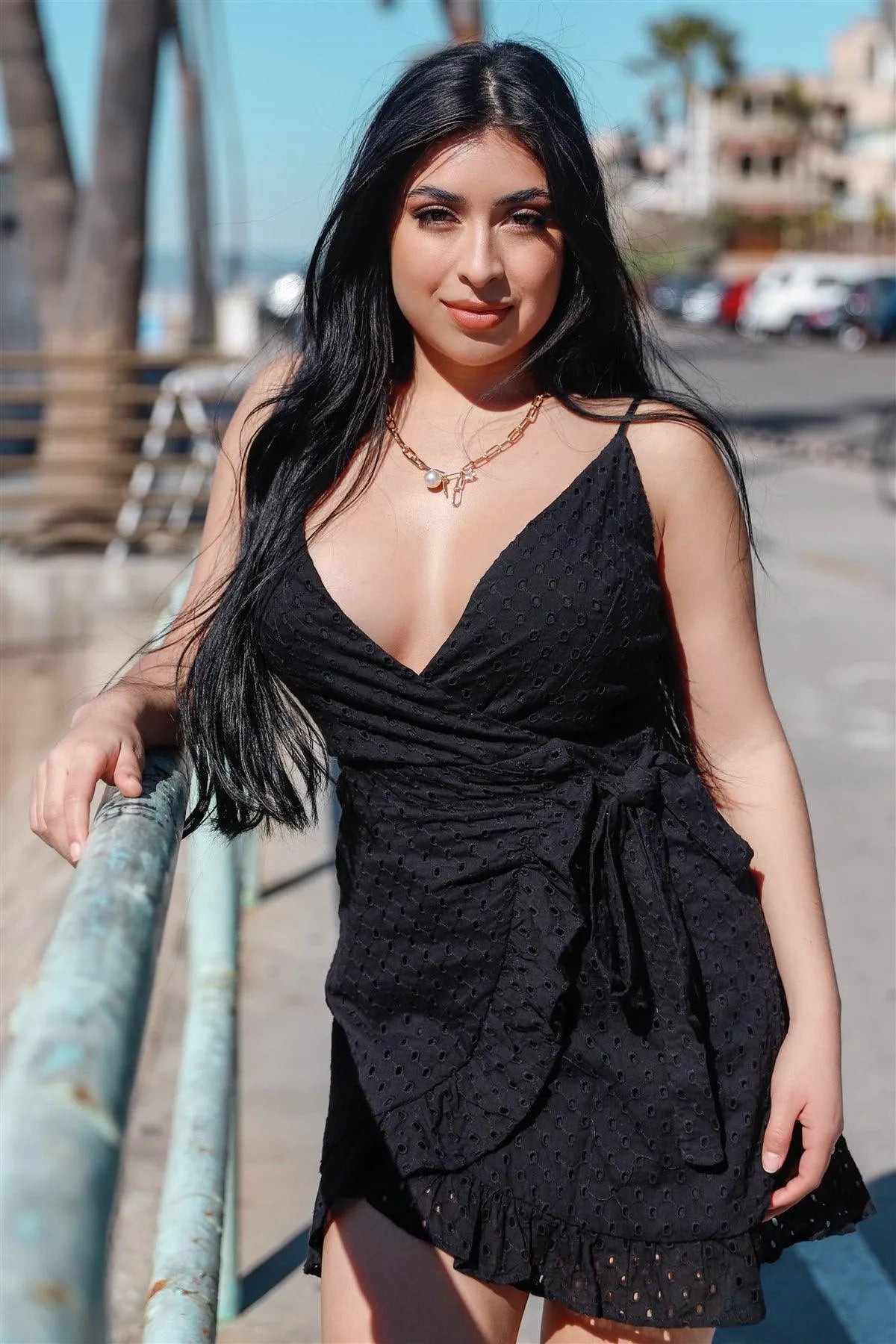 🖤 Item features: Black, cotton material, broderie, wrap style, v-neckline, side self-tie detail, sleeveless, adjustable straps, ruffle hem, hidden back zipper and hook & eye closure, partially lined, non-sheer, non-stretchy, casual, girlish, cute, chic, spring/summer collection