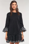 Black Crochet Embroidery Drop Waist Scallop Hem Flare Skirt Detail Long Sleeve Mini Sweater Dress /1-2-2-1