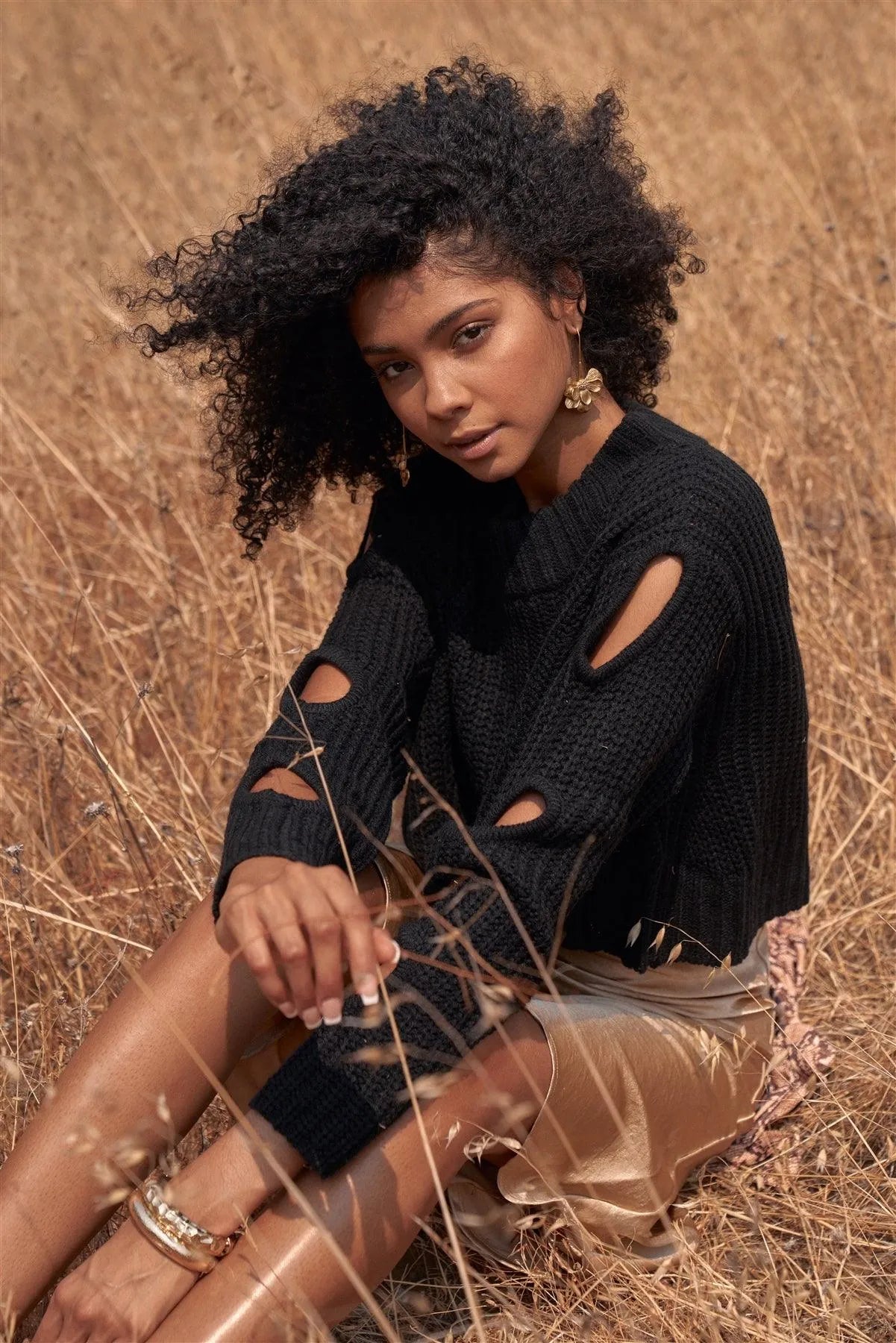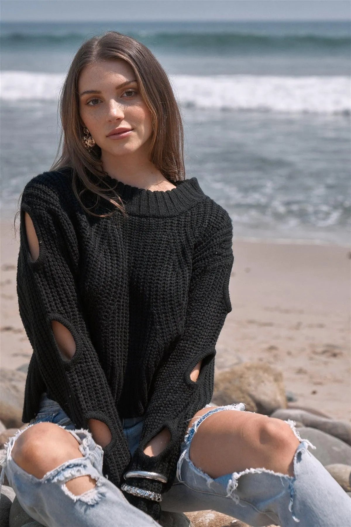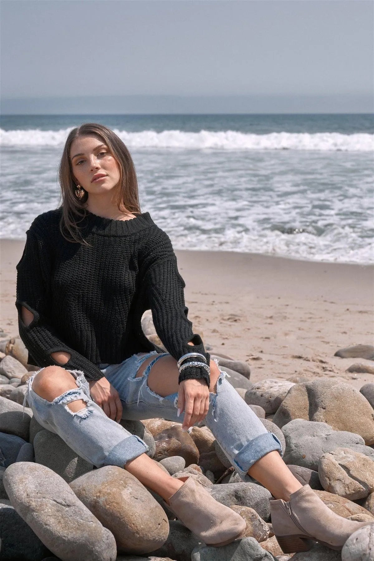 Cozy Days Black Round Neck Long Cut-Out Detail Sleeve Cable Knit Cropped Sweater