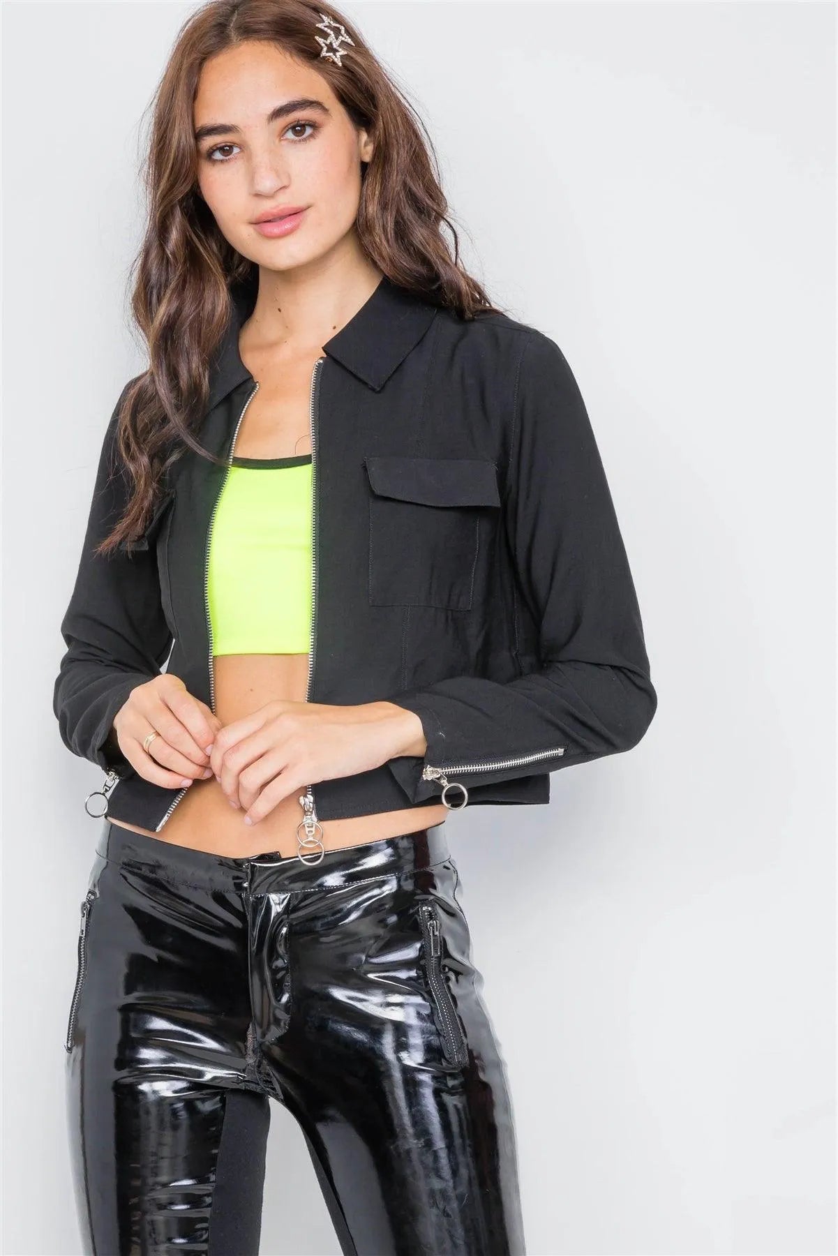 Black Double Zipper Crop Cargo Jacket /2-2-2