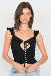 Top Features: adjustable v-neck draw string, front button closure, ruched elastic bodice, embroidered eyelet frill trim, solid, boho, crop length, sleeveless, bust darts, unlined, super stretchy.Item Measurements: Length: 16" , Bust: 24"Model is 5'9 wearing a size Small ( Waist: 23.5", Bust: 32B, Hips: 36")Item comes pre-packed with hang tagsTrue to SizeAlso available in Ecru