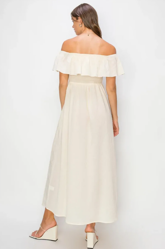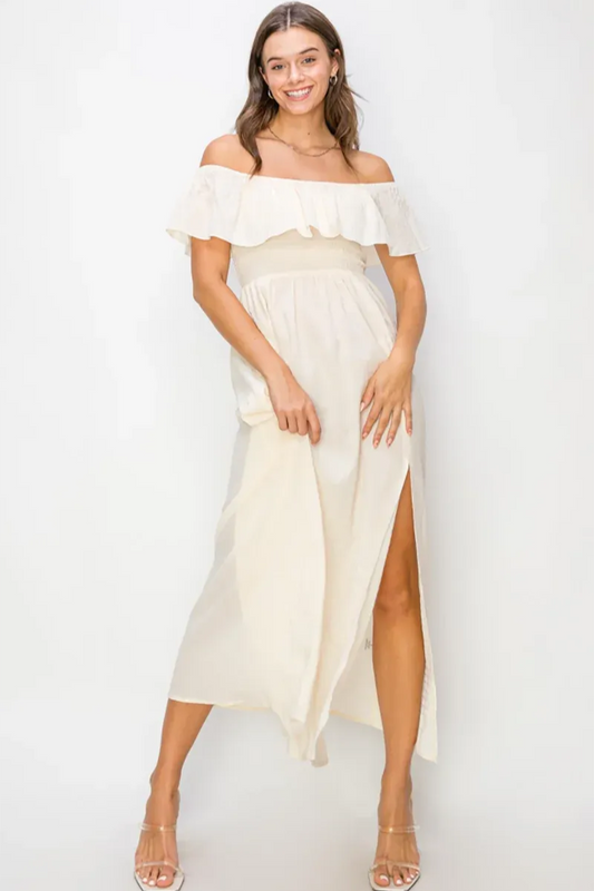 Ruffle Tiered Off Shoulder Side Slit Smocked Midi DressVendor:HYFVE