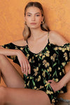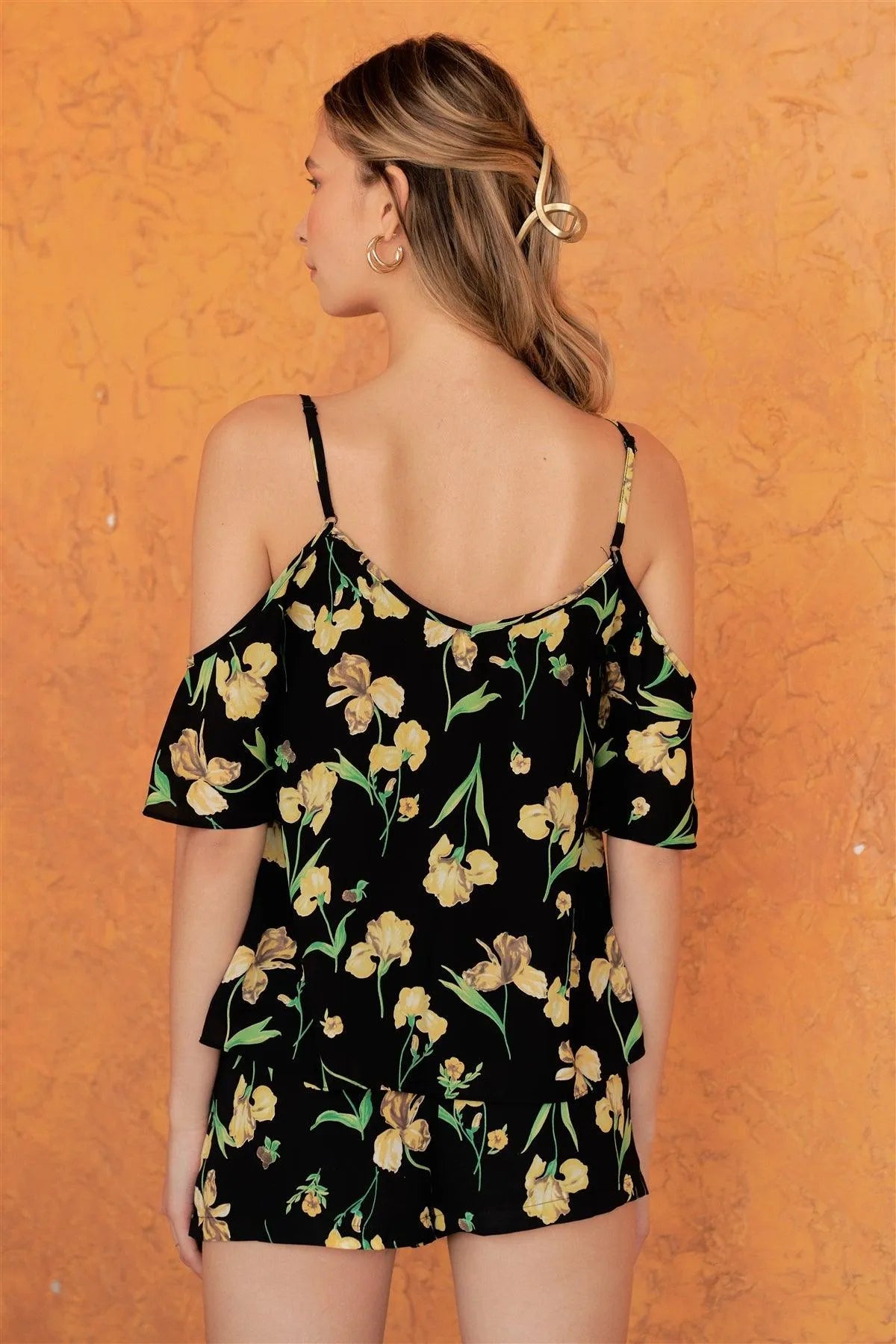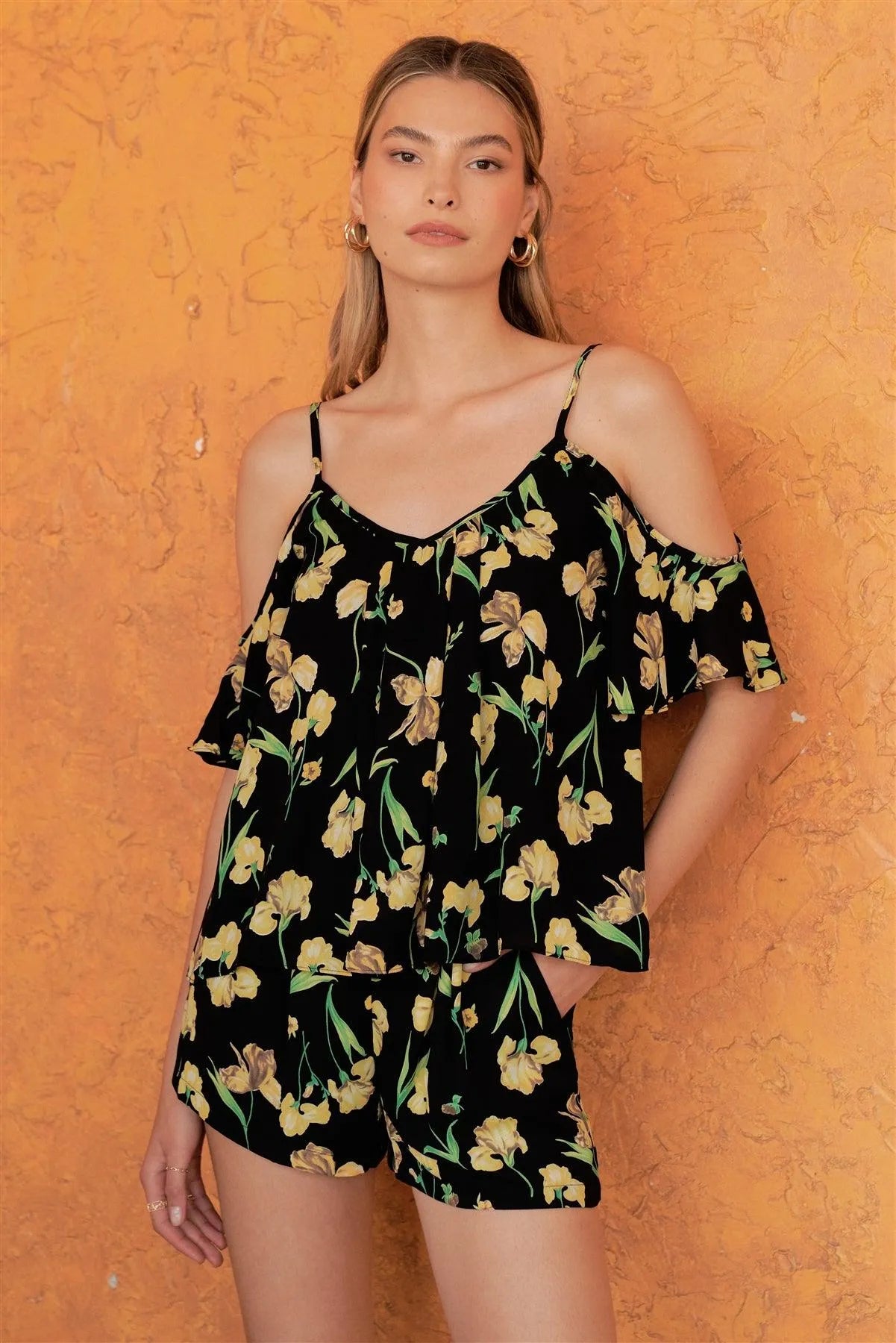 Iris Black & Yellow Floral Print Cold Shoulder Top