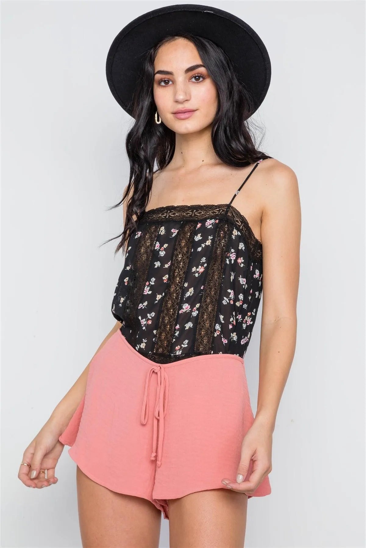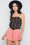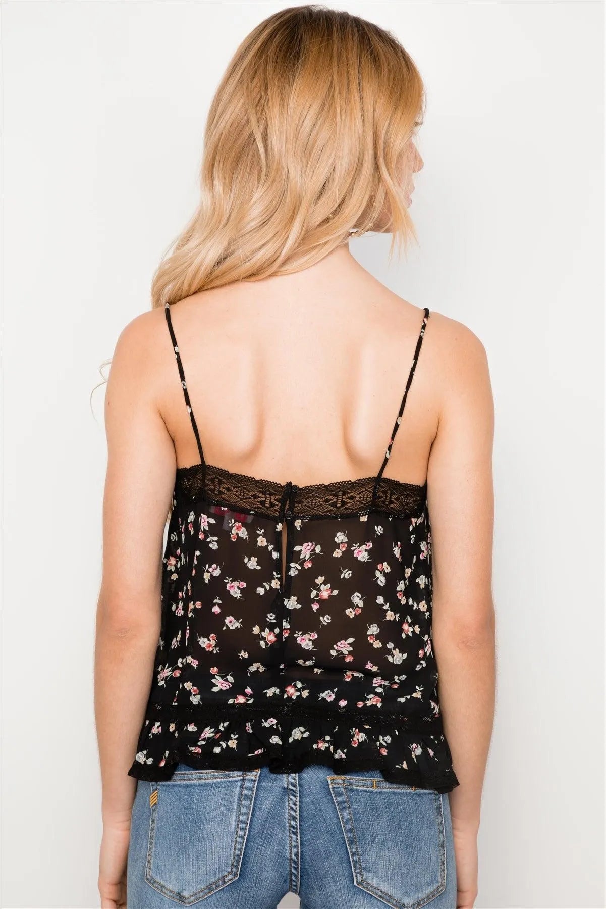 Black Floral Print Lace Trim Cami Sheer Top / 3-2-1