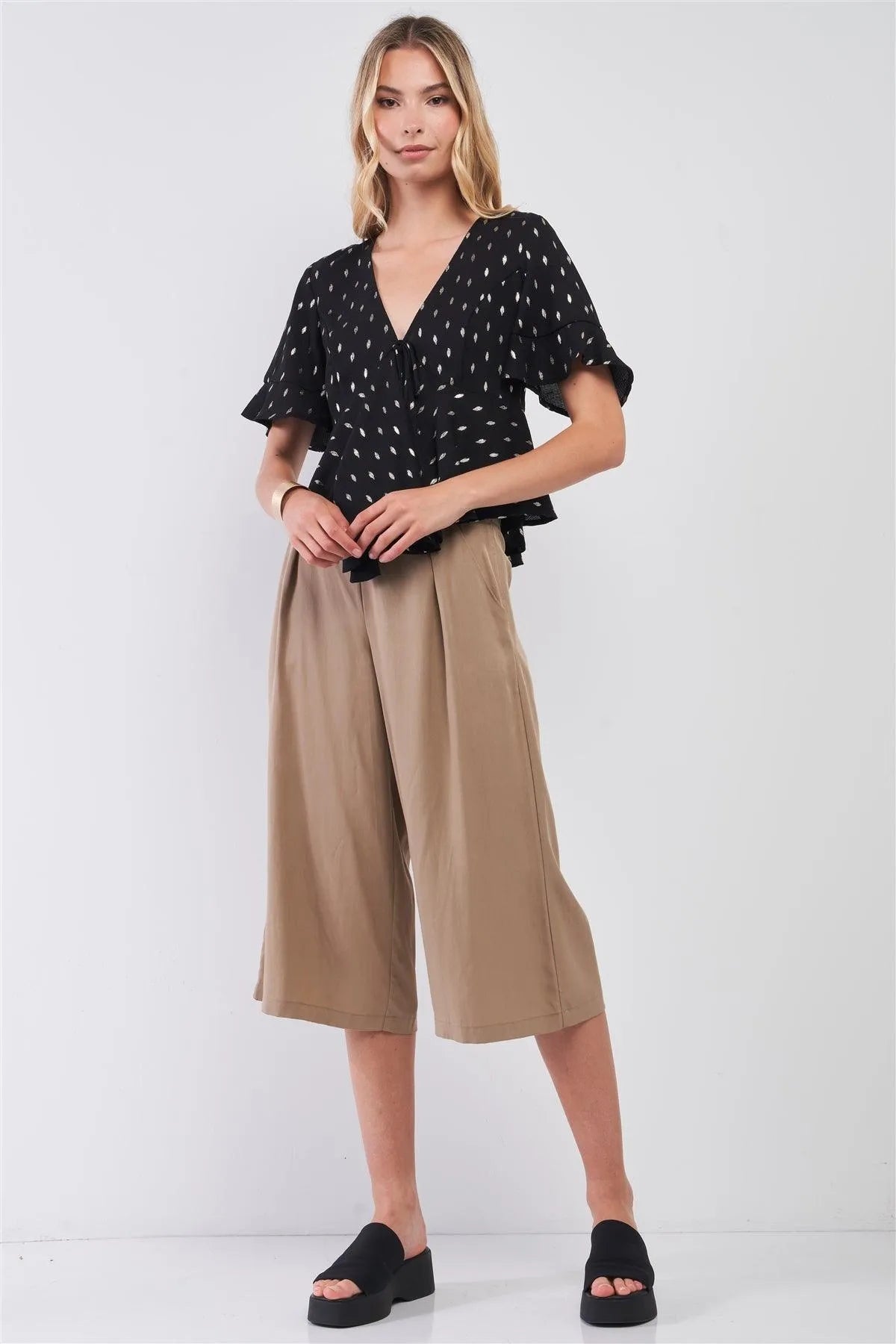 Black & Gold Brush Strokes Print V-Neck Short Angel Sleeve Tie Front Detail Top