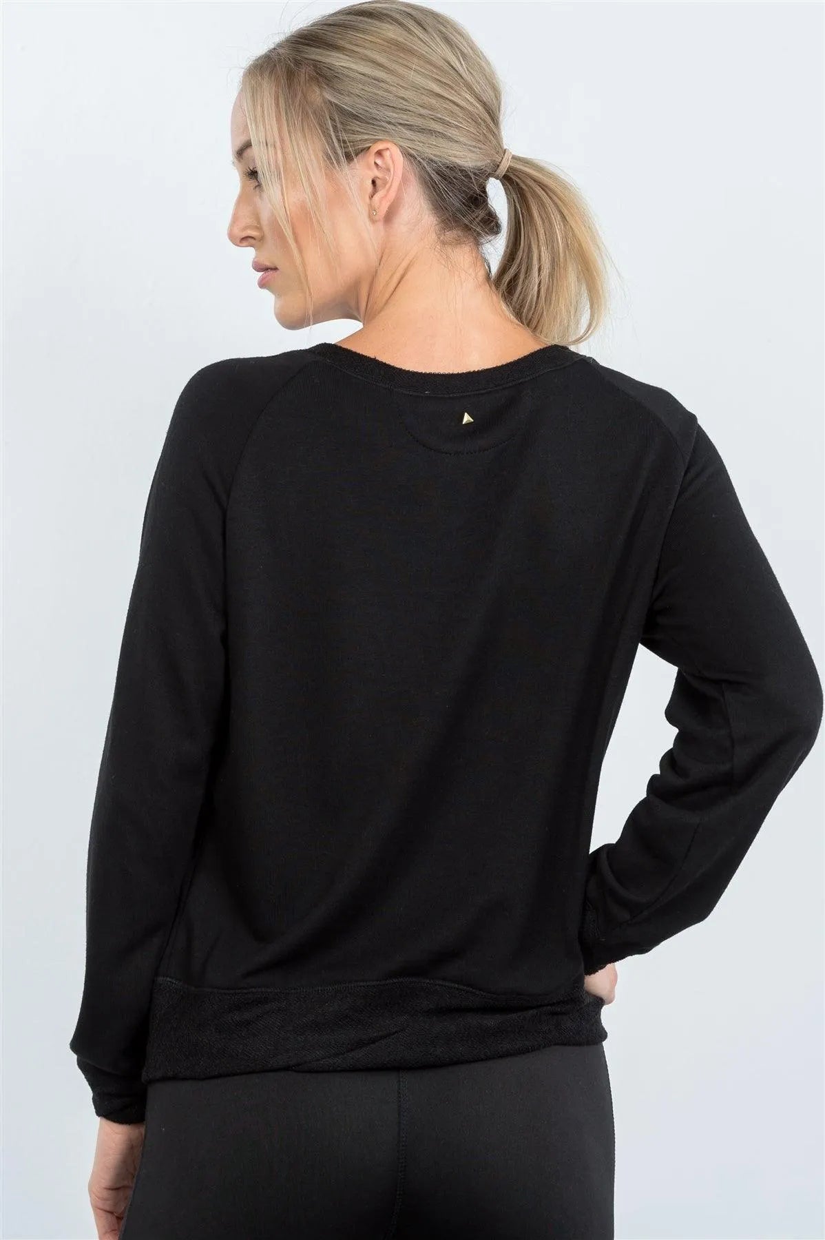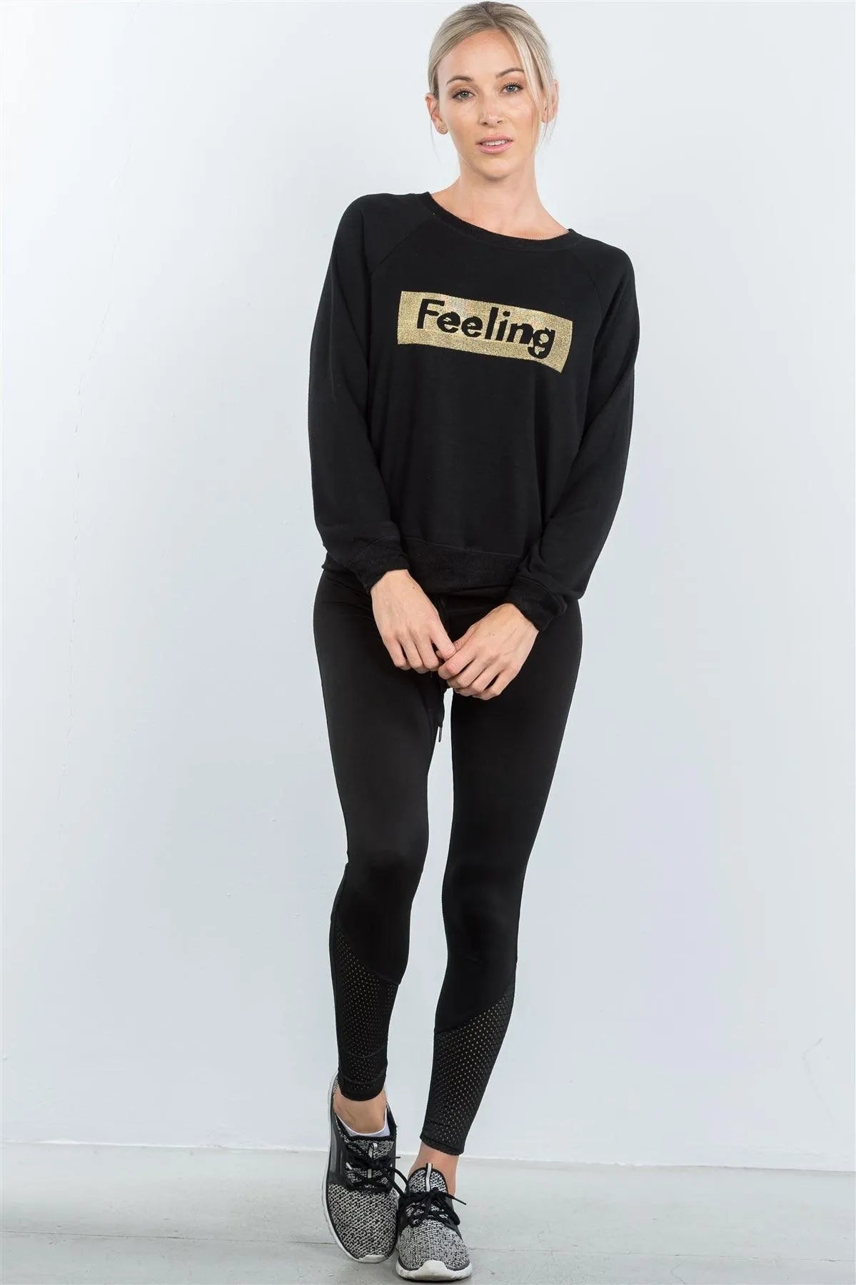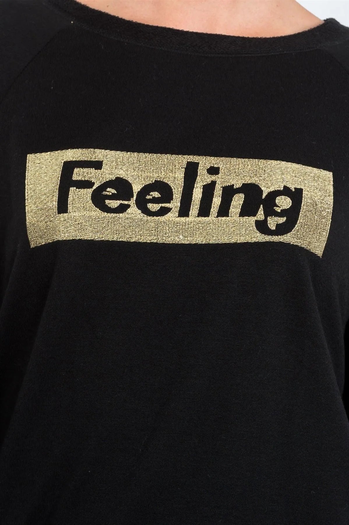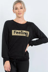 Sweater features: long sleeves, round neckline, graphic front FEELING, relaxed fit. Model is 5'9 wearing a size Small ( Waist: 24", Bust: 32B, Hips: 34")Item measurements: Length: 22", Bust: 40", Sleeve Length: 26"