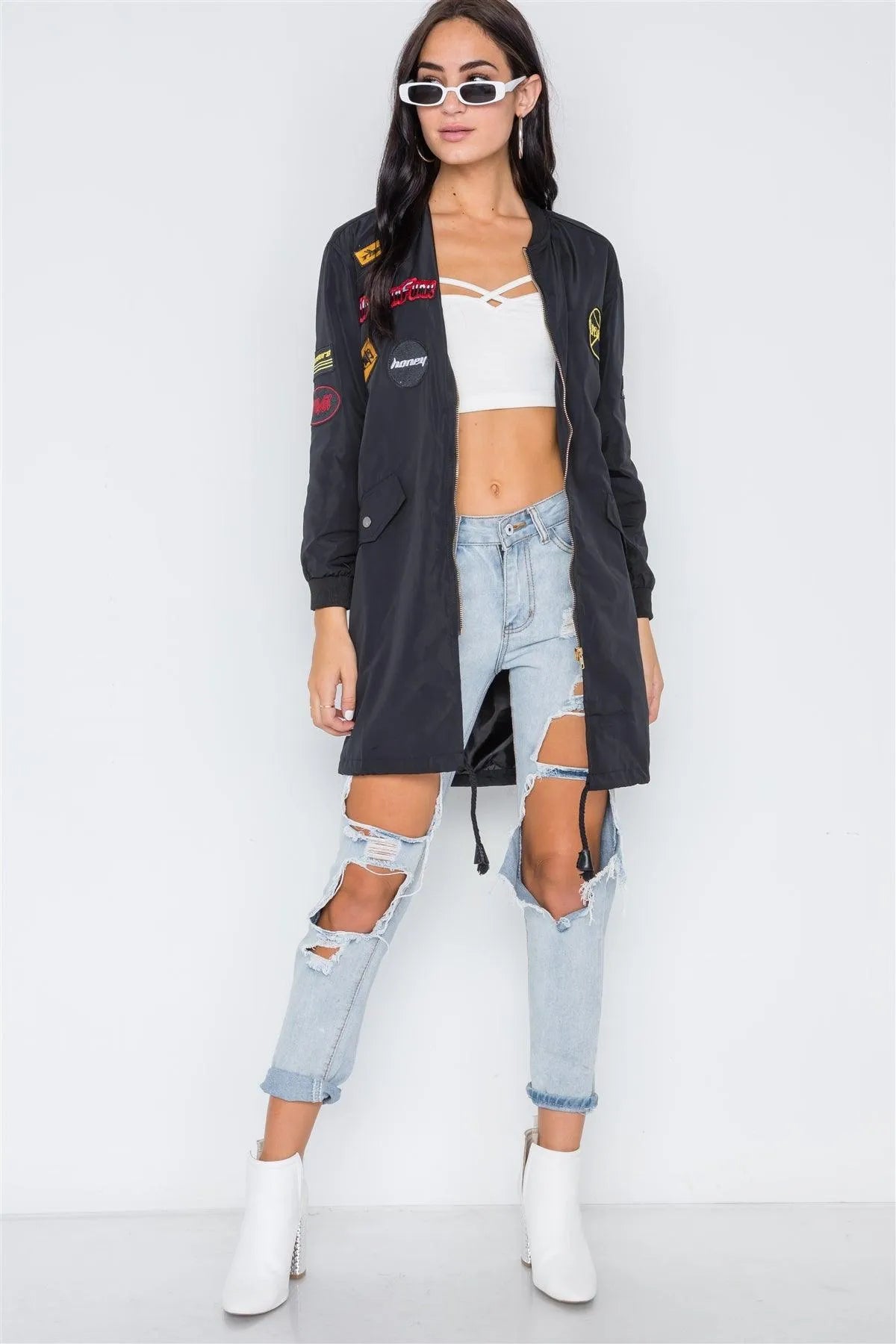Jacket features: contrast ribbed trim, long sleeves, front pockets, front zip closure, multi patches allover, drawsring hem, linedModel is 5'9 wearing a size Small ( Waist: 24", Bust: 32A, Hips: 34")Size Small Item Measurements: Length: 34", Bust: 40", Sleeves: 20"True to sizeAvailable in Olive