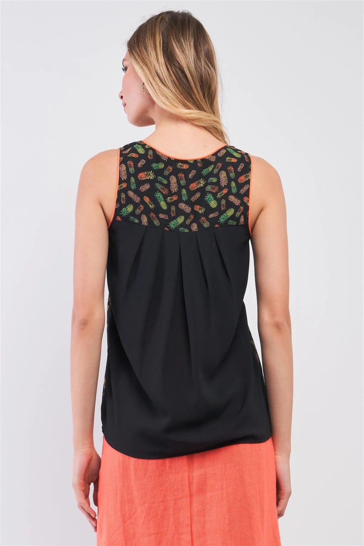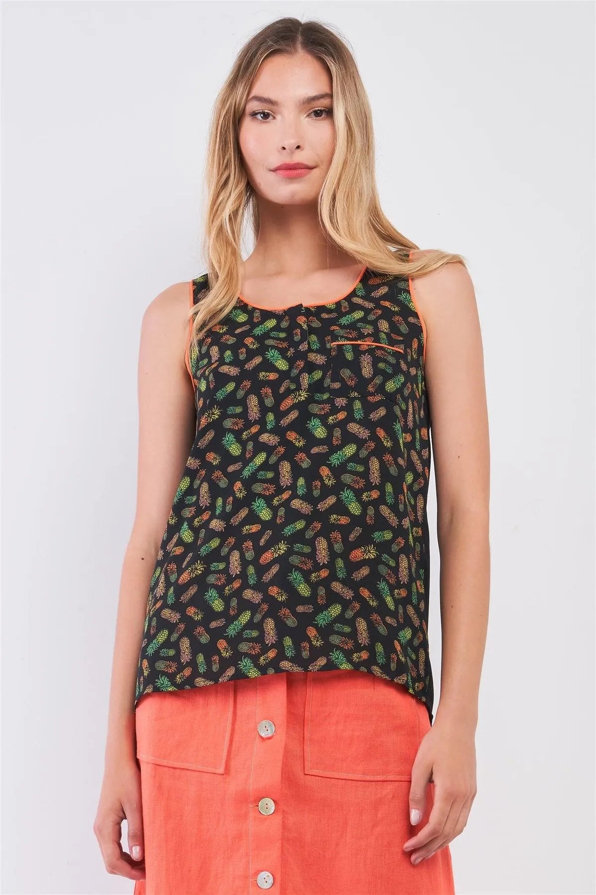 Pineapple Paradise Black & Green Sleeveless Pineapple Print Single Pocket Detail Tank Top /1-2-2-1