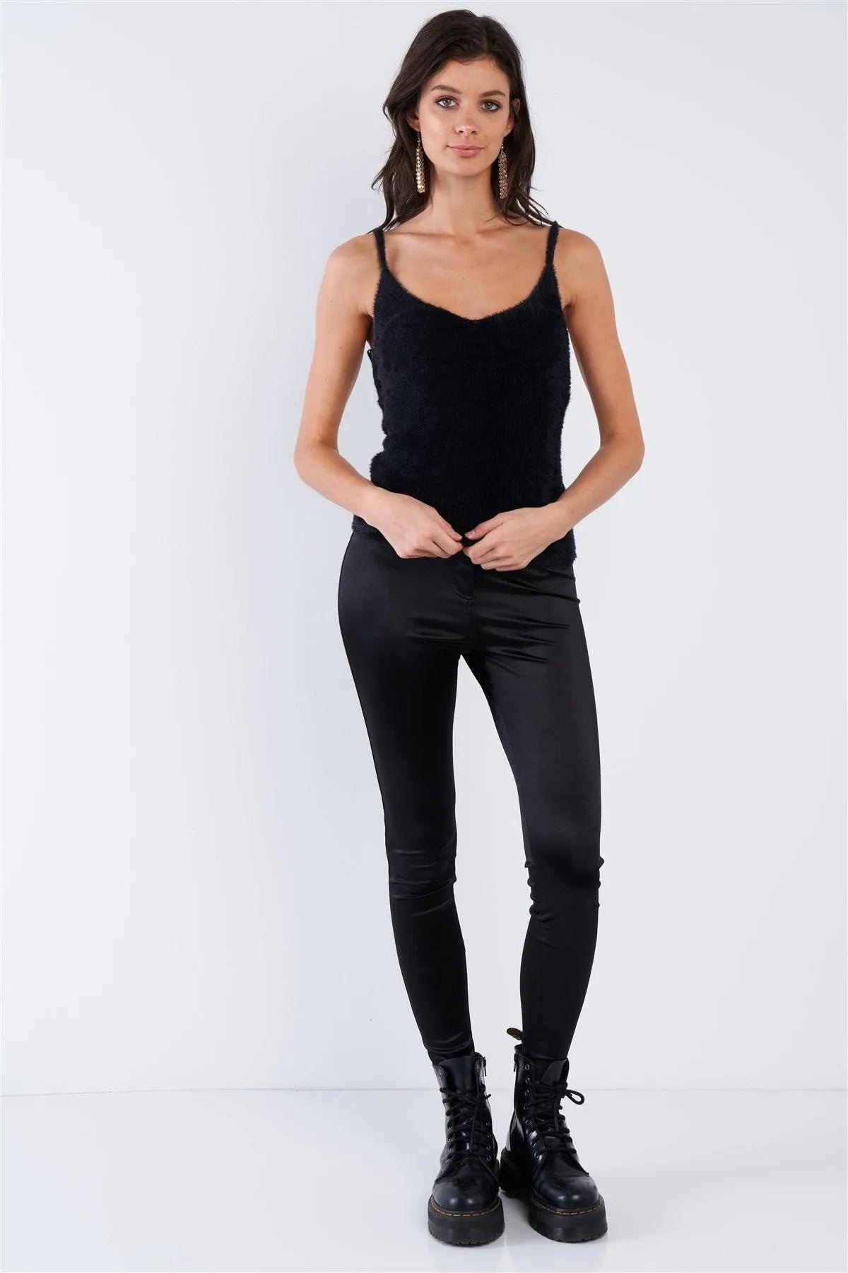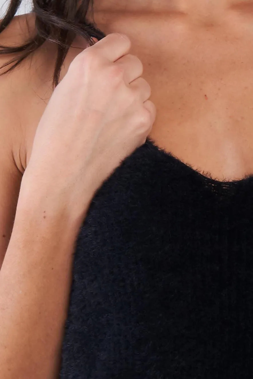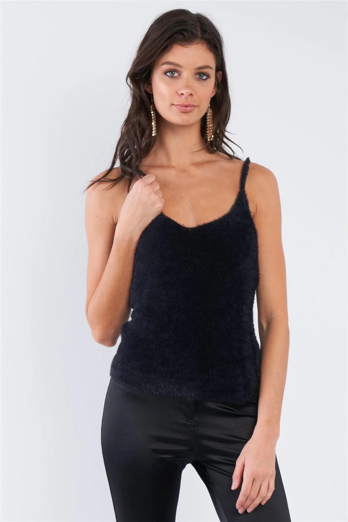Black Hairy Ribbed V-Neck Spaghetti Strap Tank Top /3-2-1