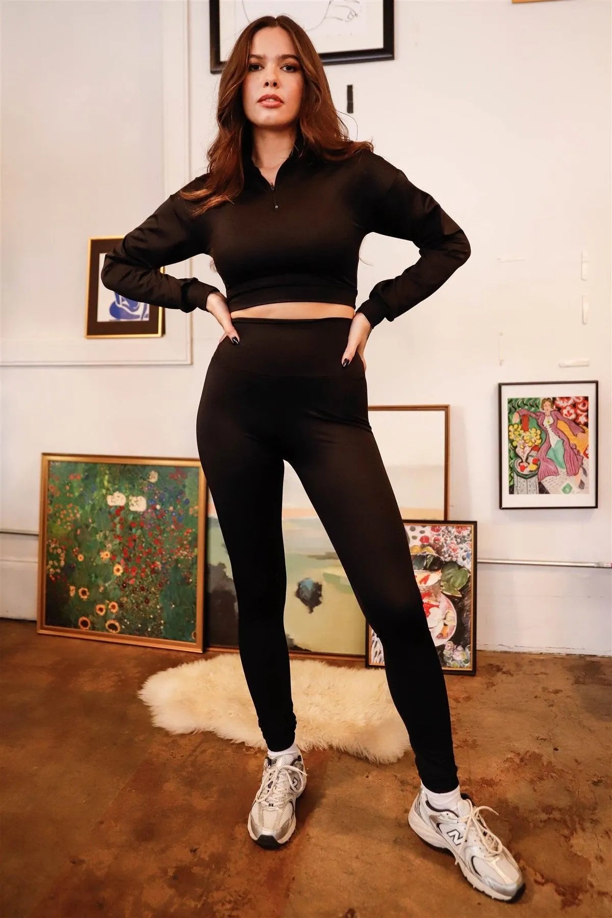 Black Shine Half Zip Front Mock Neck Cropped Top & High Waist Leggings Set /2-2-2