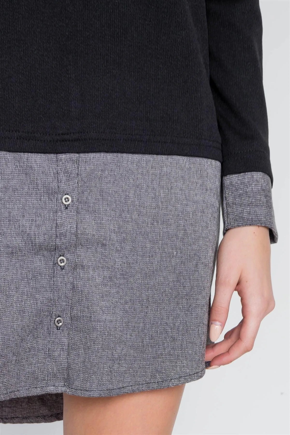 🖤 Item features: Black, ribbed, crew-neck, long sleeves with contrast cuffs, dropped shoulders, contrast shirt type hem with button closure, unlined, relaxed fit, semi-stretchy, mini length, casual, stylish, simple but chic