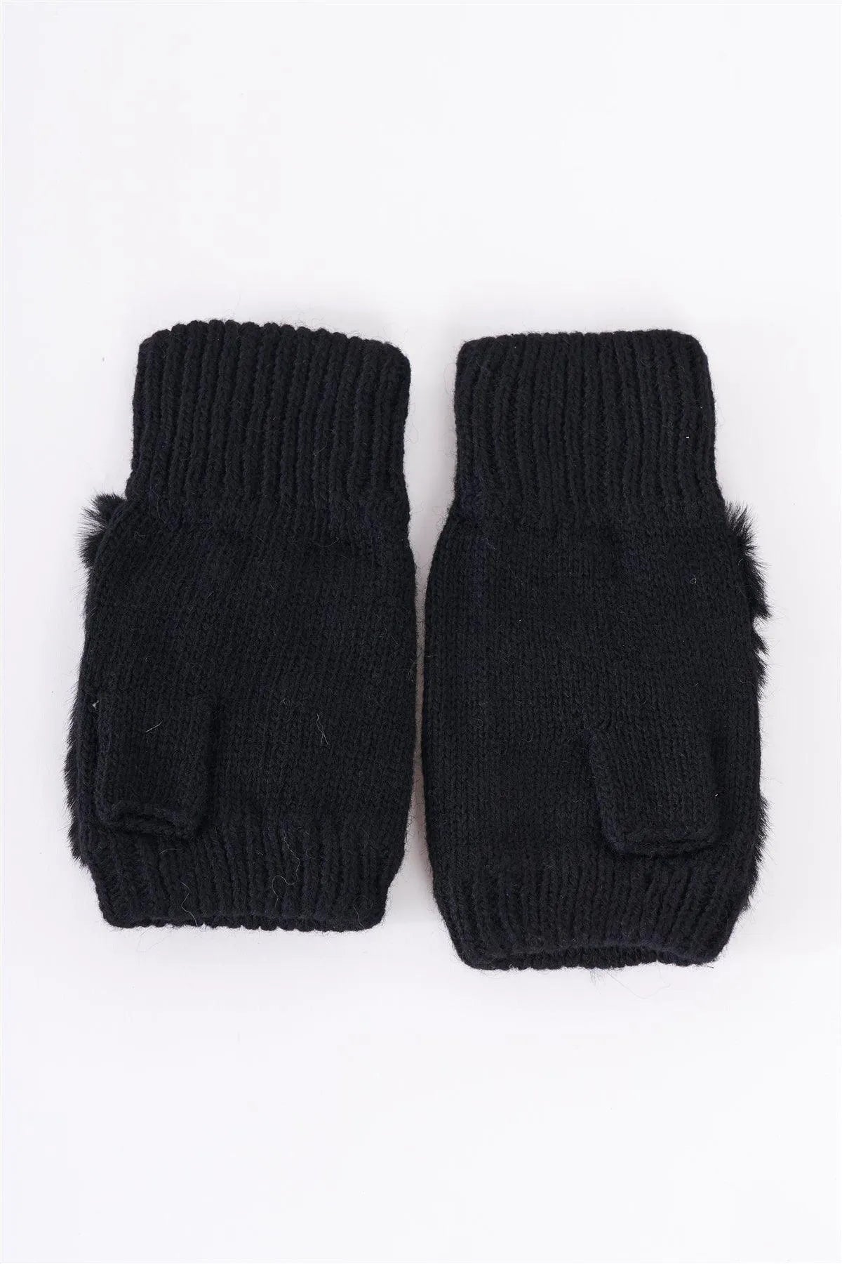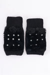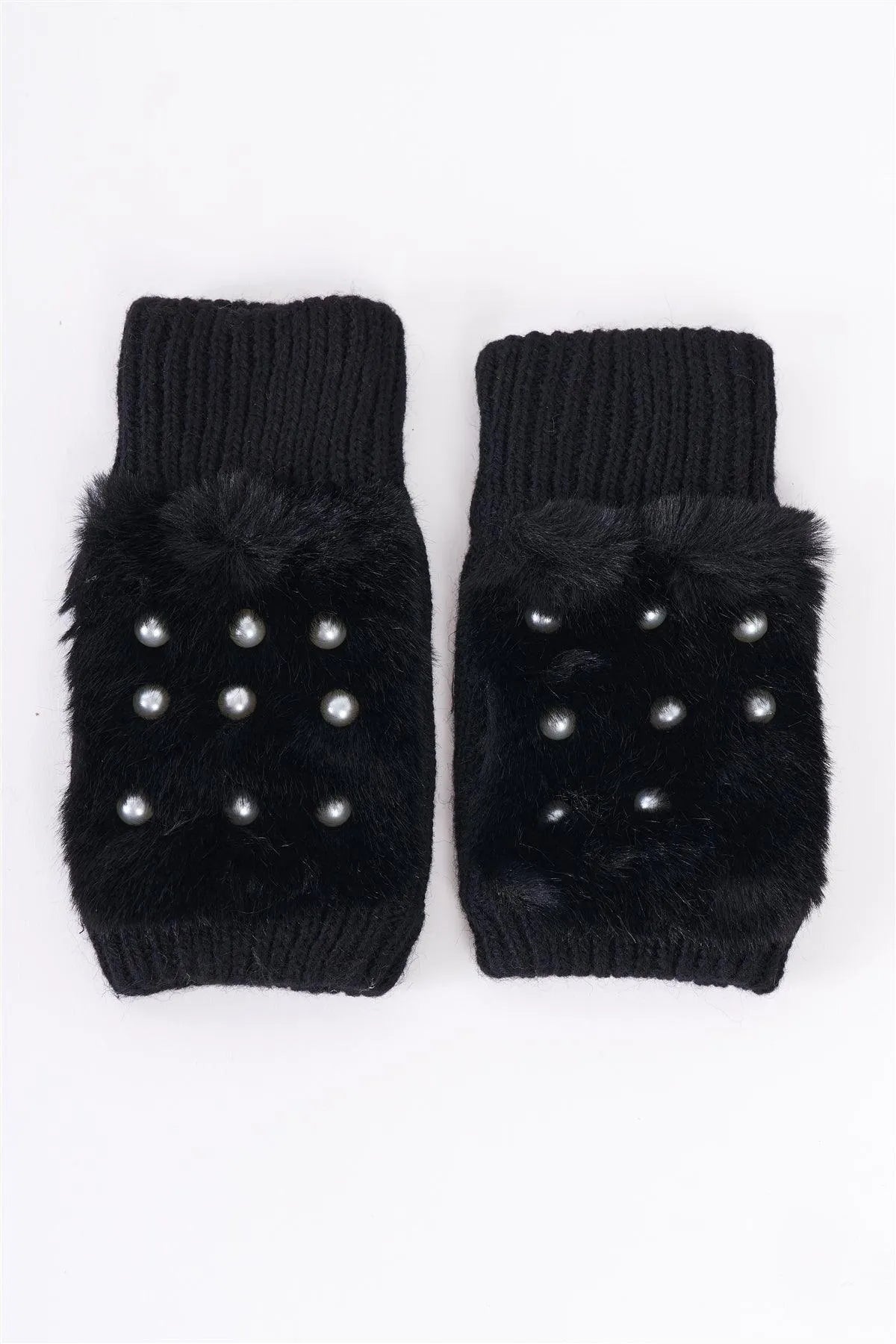 Black Knit Furry Fingerless Pearl Detail Winter Gloves /3 Pieces