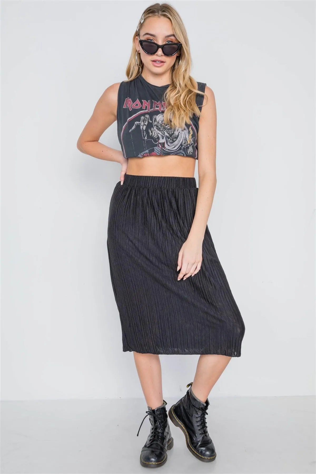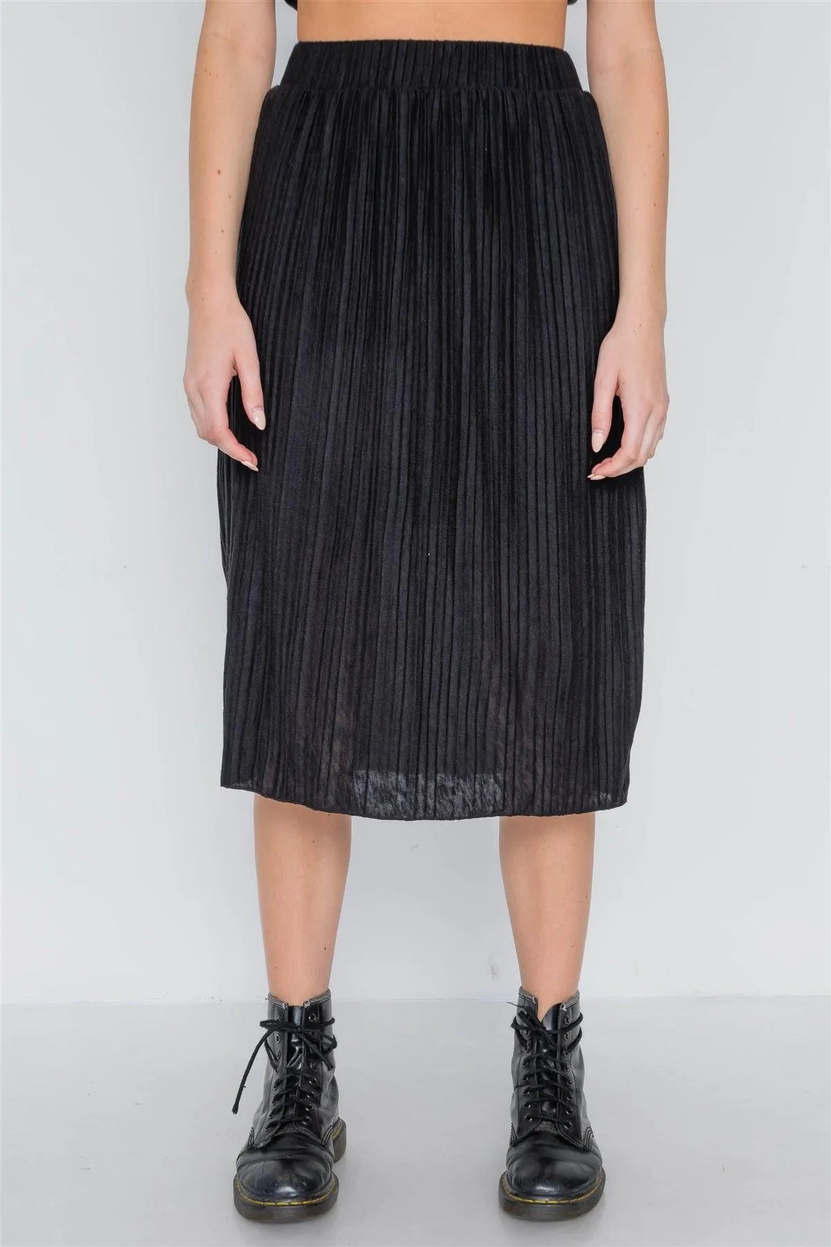 Black Knit Pleated High-Waist Midi Skirt /2-2-3