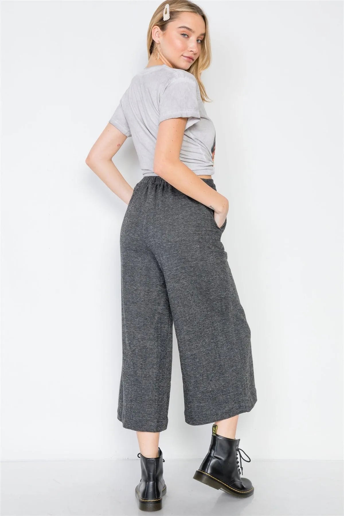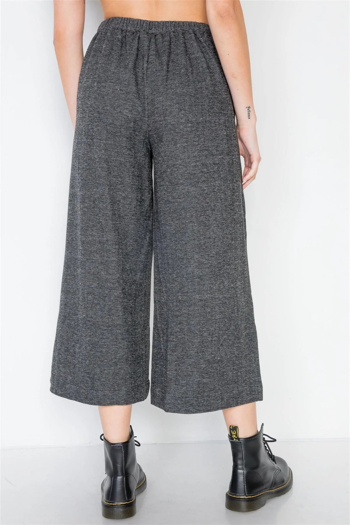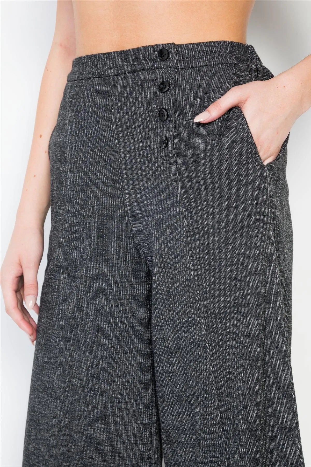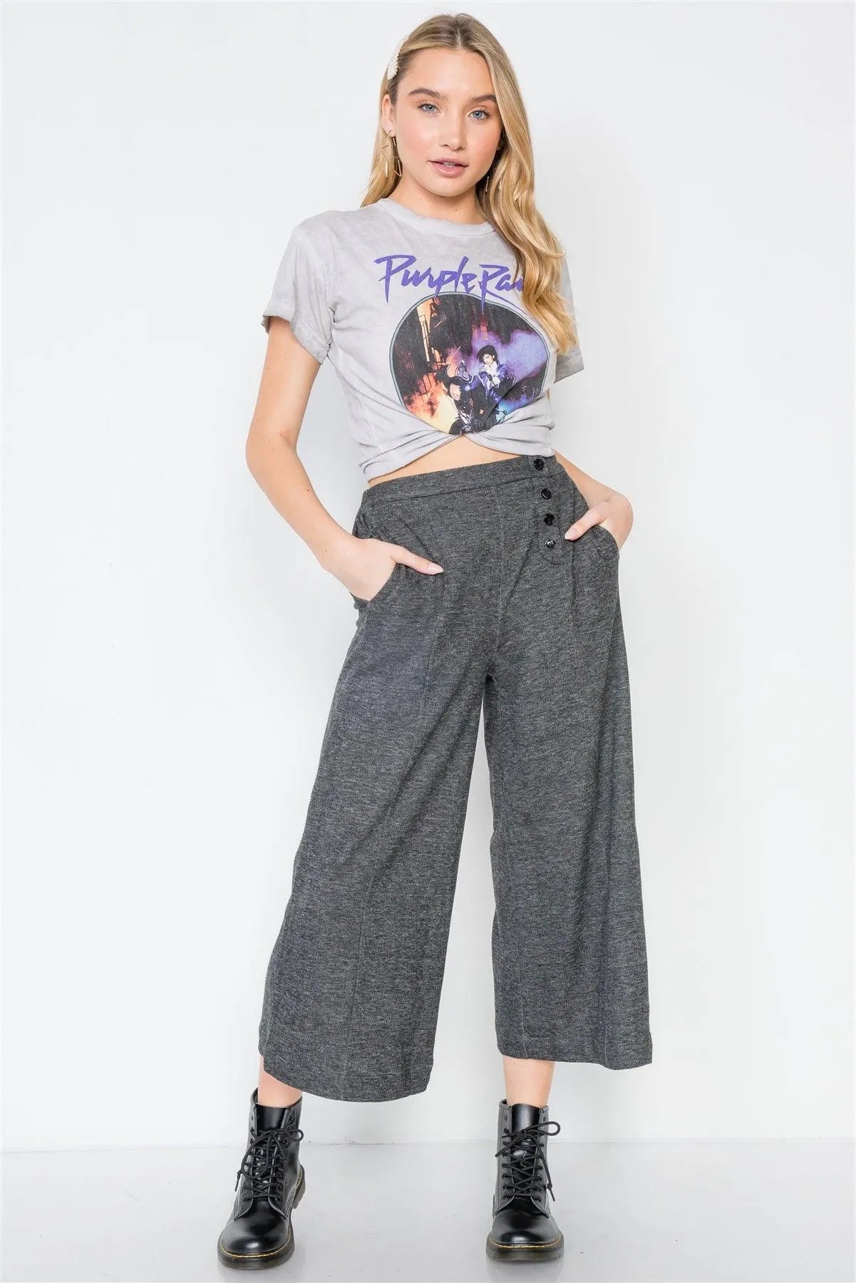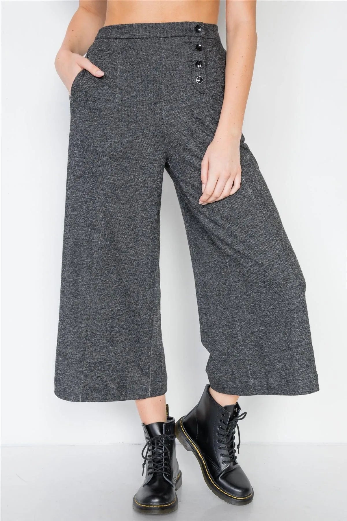 Black Knit Side Button Wide Leg Ankle Pants /1-2-2