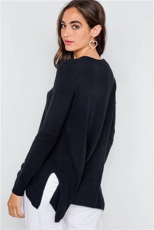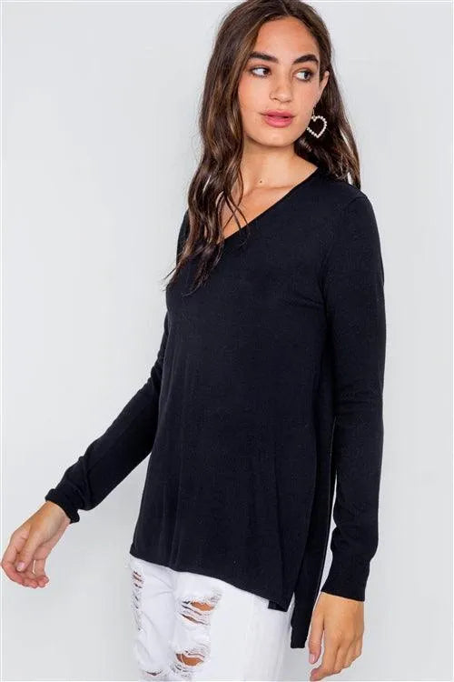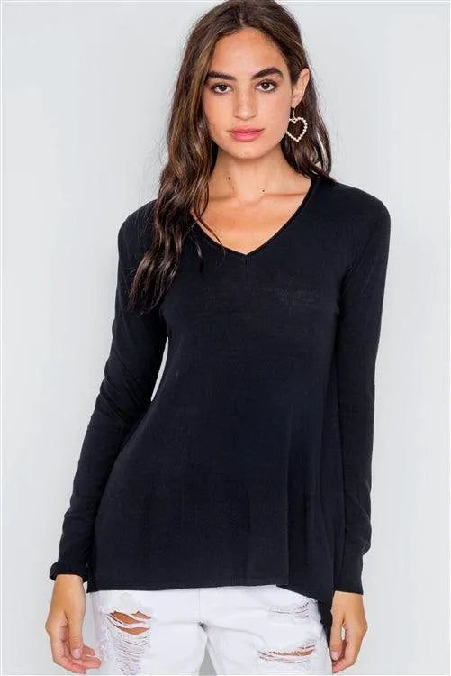 Black Knit V-Neck Casual Solid Long Sleeve Sweater