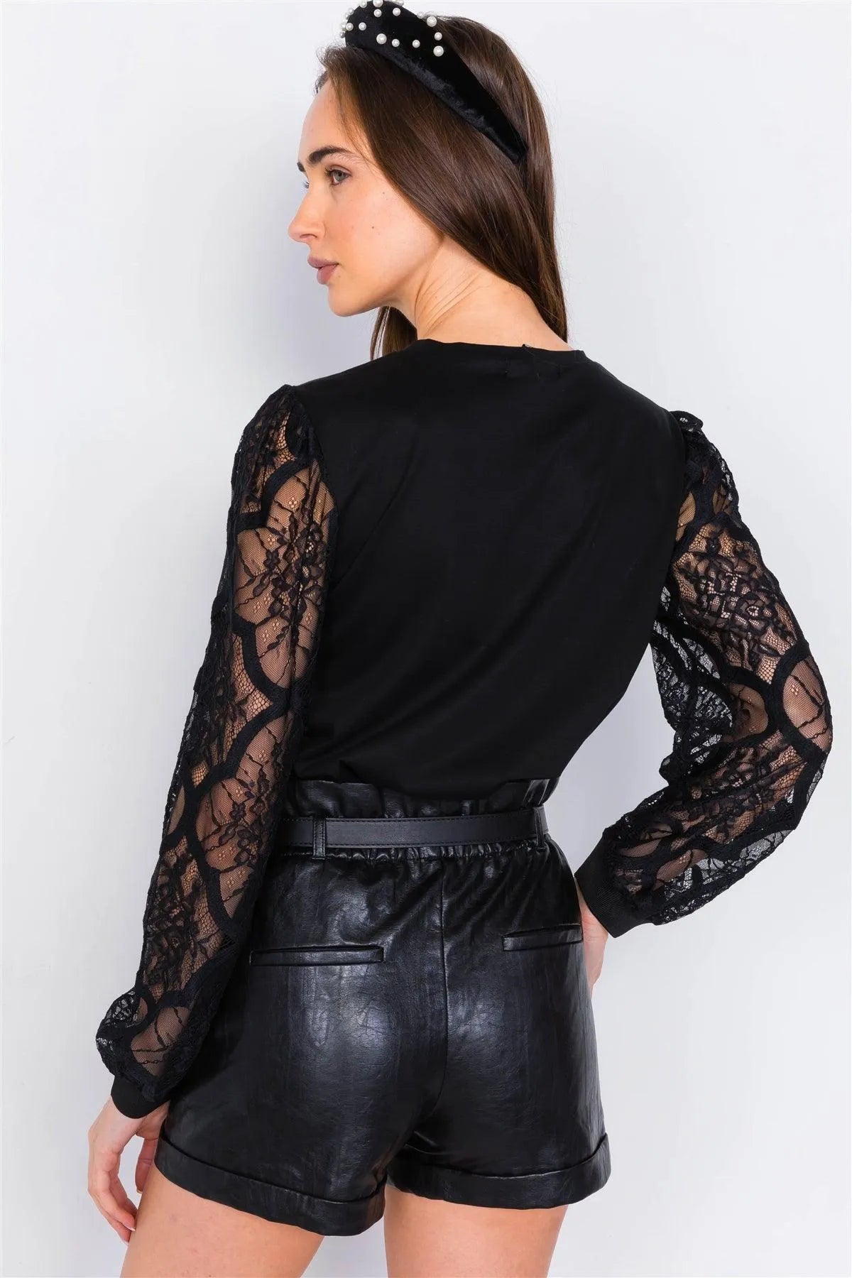 Black Lace Full Puff Sleeve Causal Office Chic Top