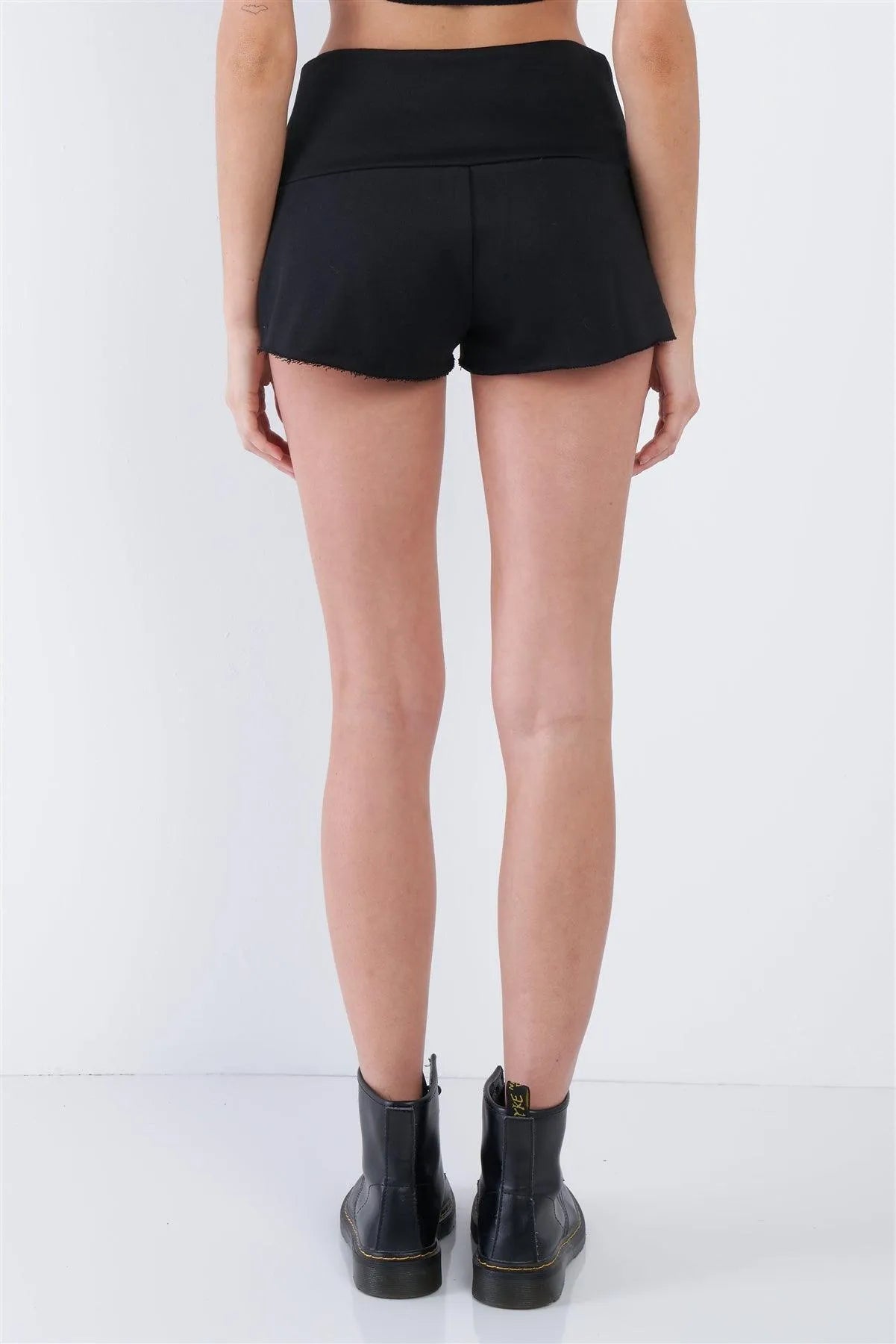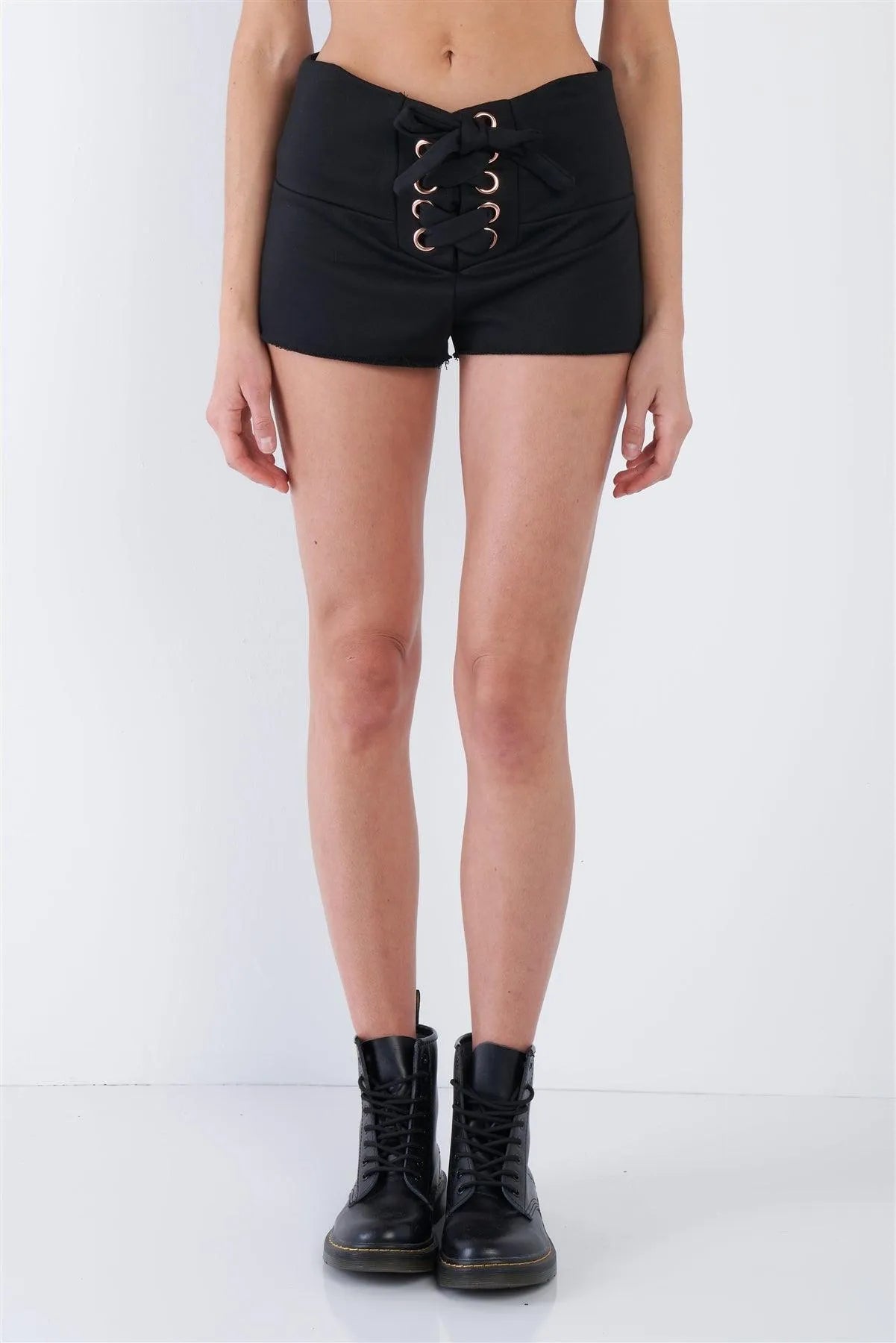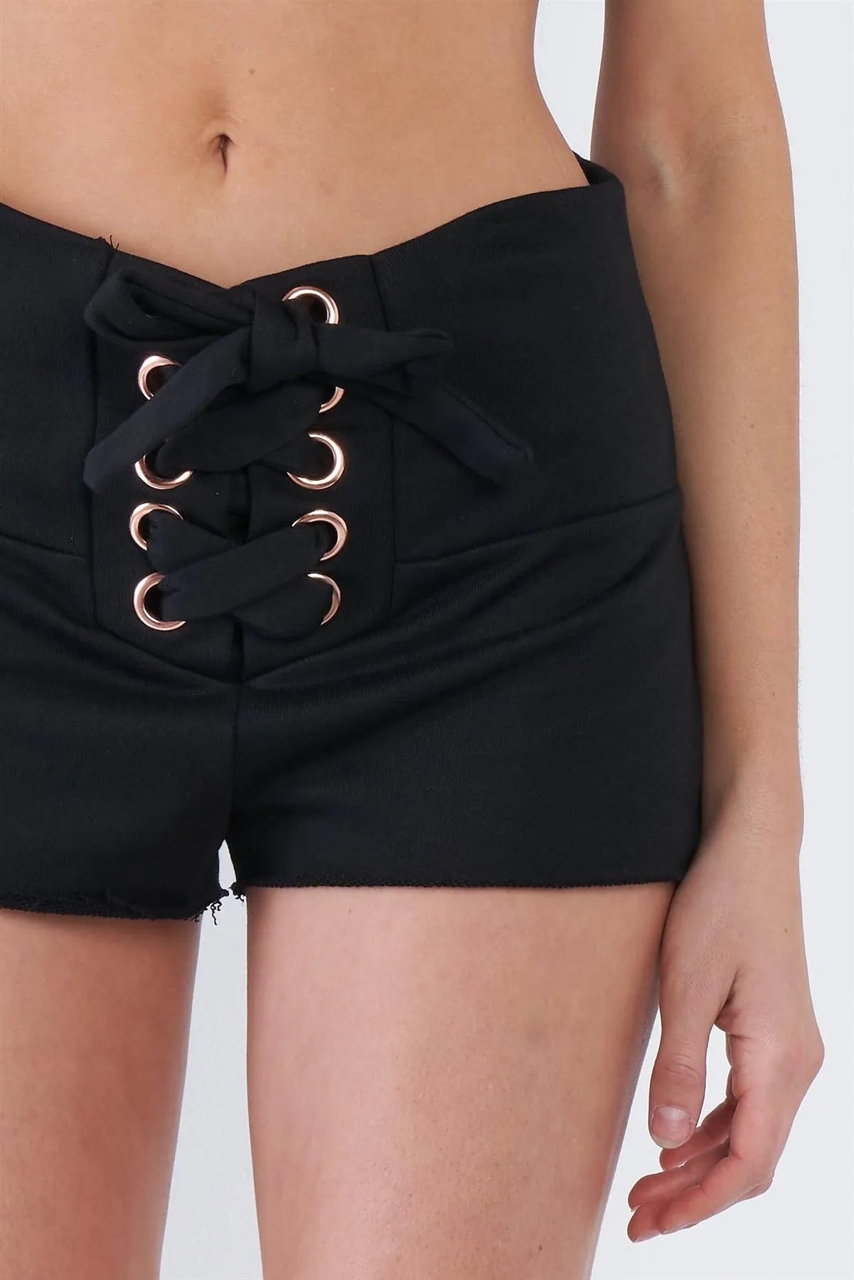 Black Lace Up Casual Raw Hem Short Shorts /2-1-1