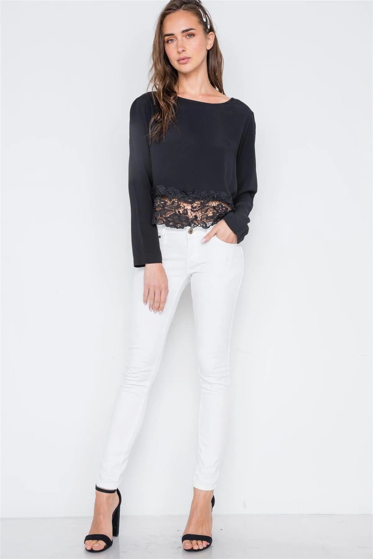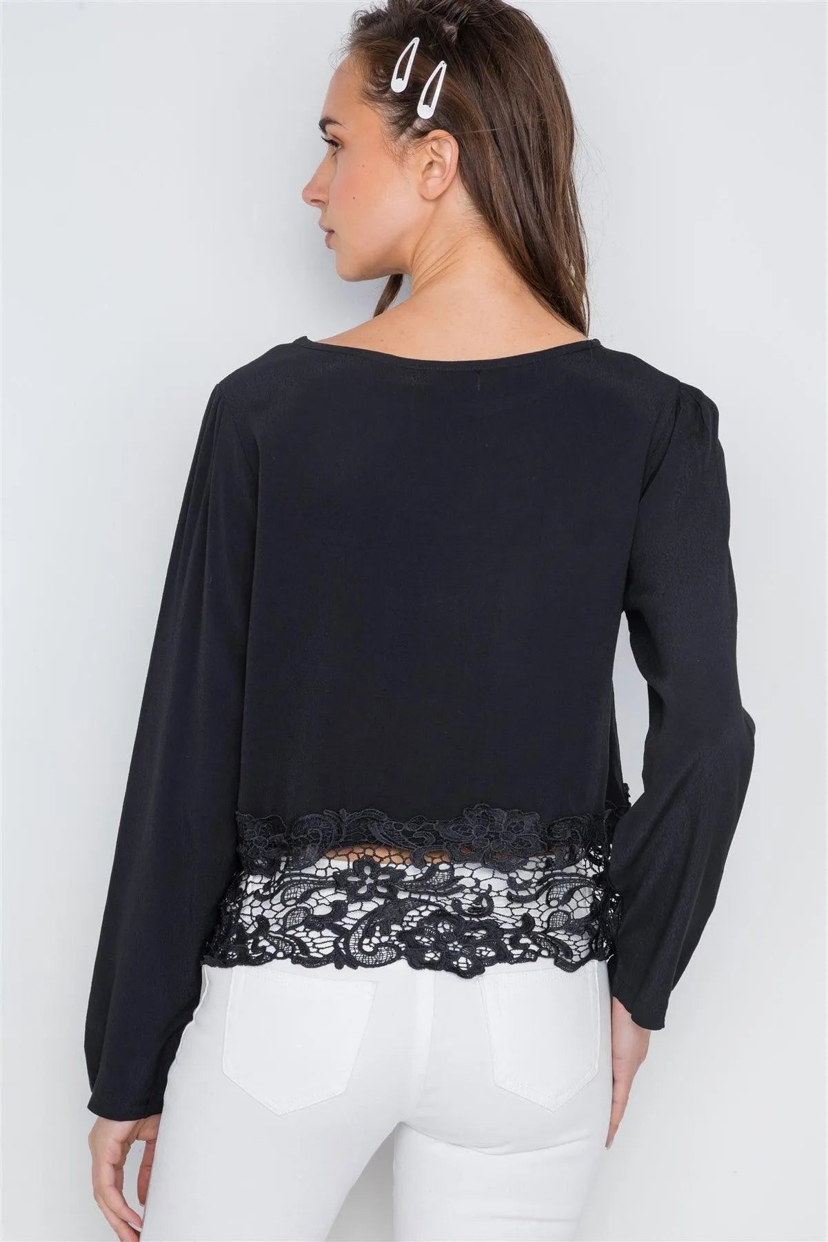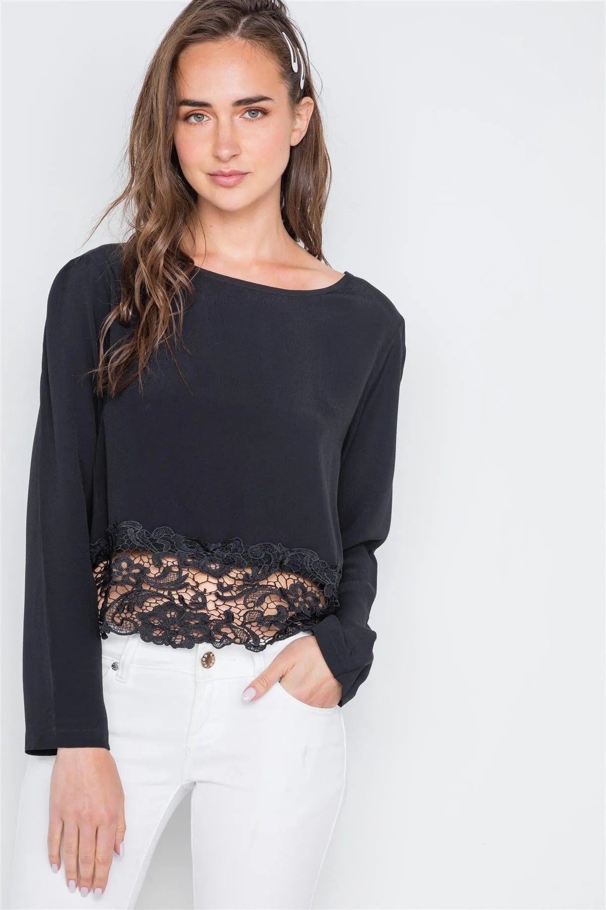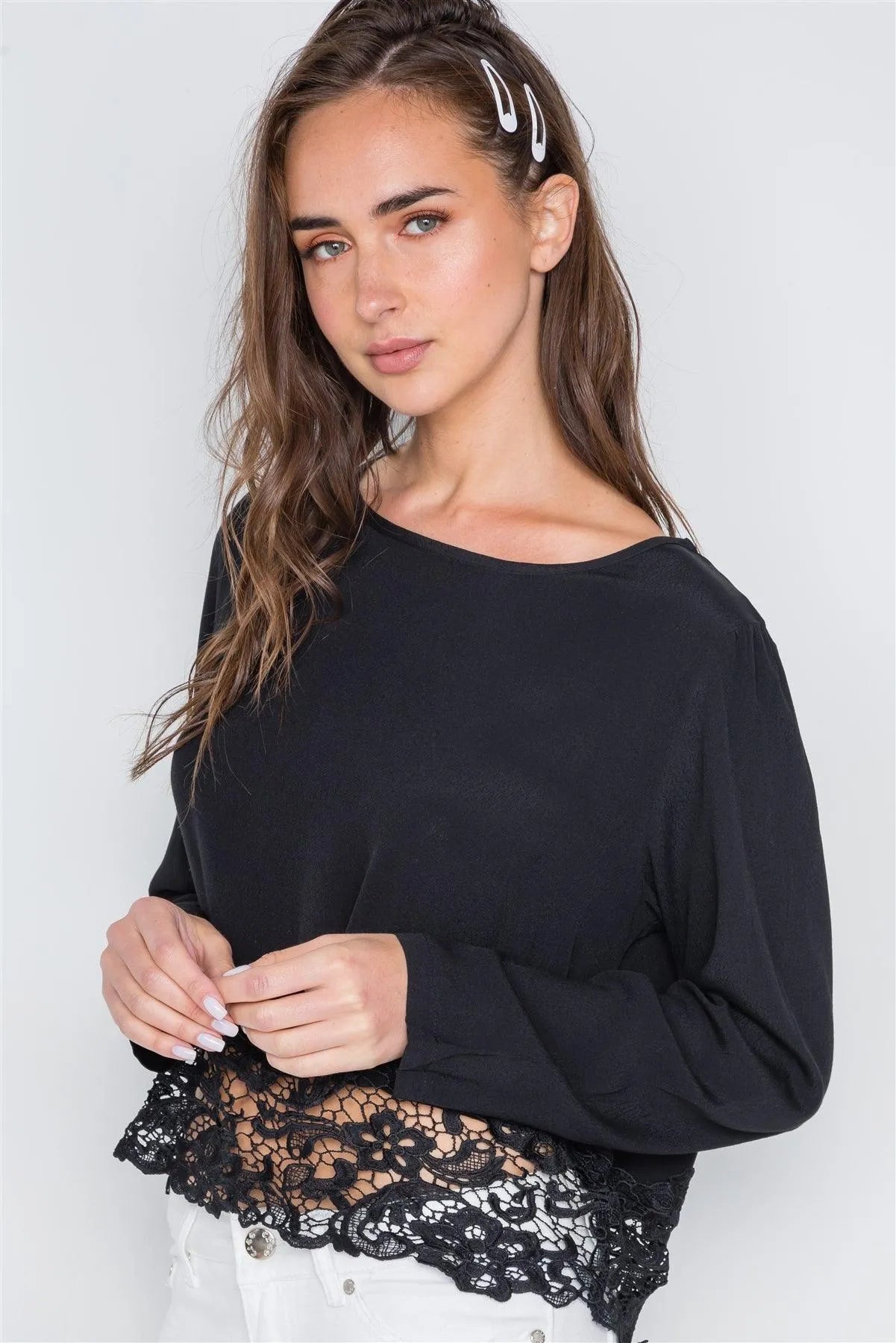 Black Long Sleeve Crochet Hem Top /2-2-2
