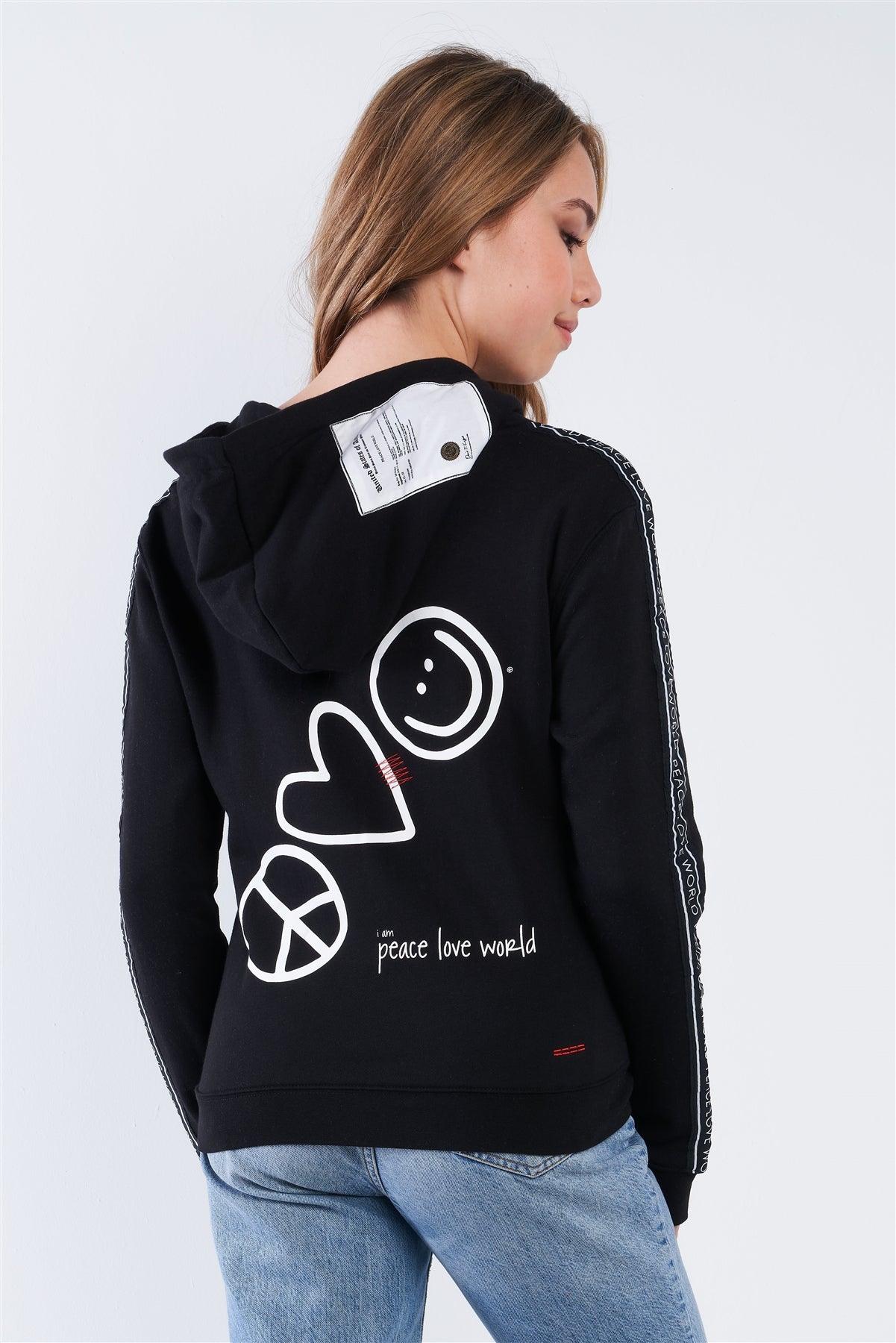Black Long Sleeve "Peace Love World" Graphic Zip Up Casual Hoodie