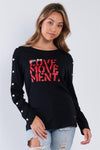 🖤 Features: Solid black, long sleeve, crew neck, "Join The Love Movement" graphic text print, snap shoulder detail, embroidered red dash marks at lower left, unlined, stretchy, casual, laidback, fall-spring.