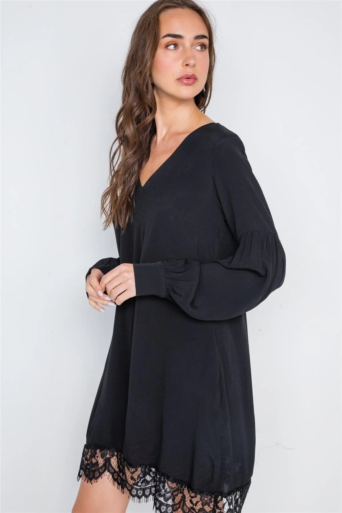 Black Long Sleeve Lace Hem V-Neck Mini Dress /1-1-2