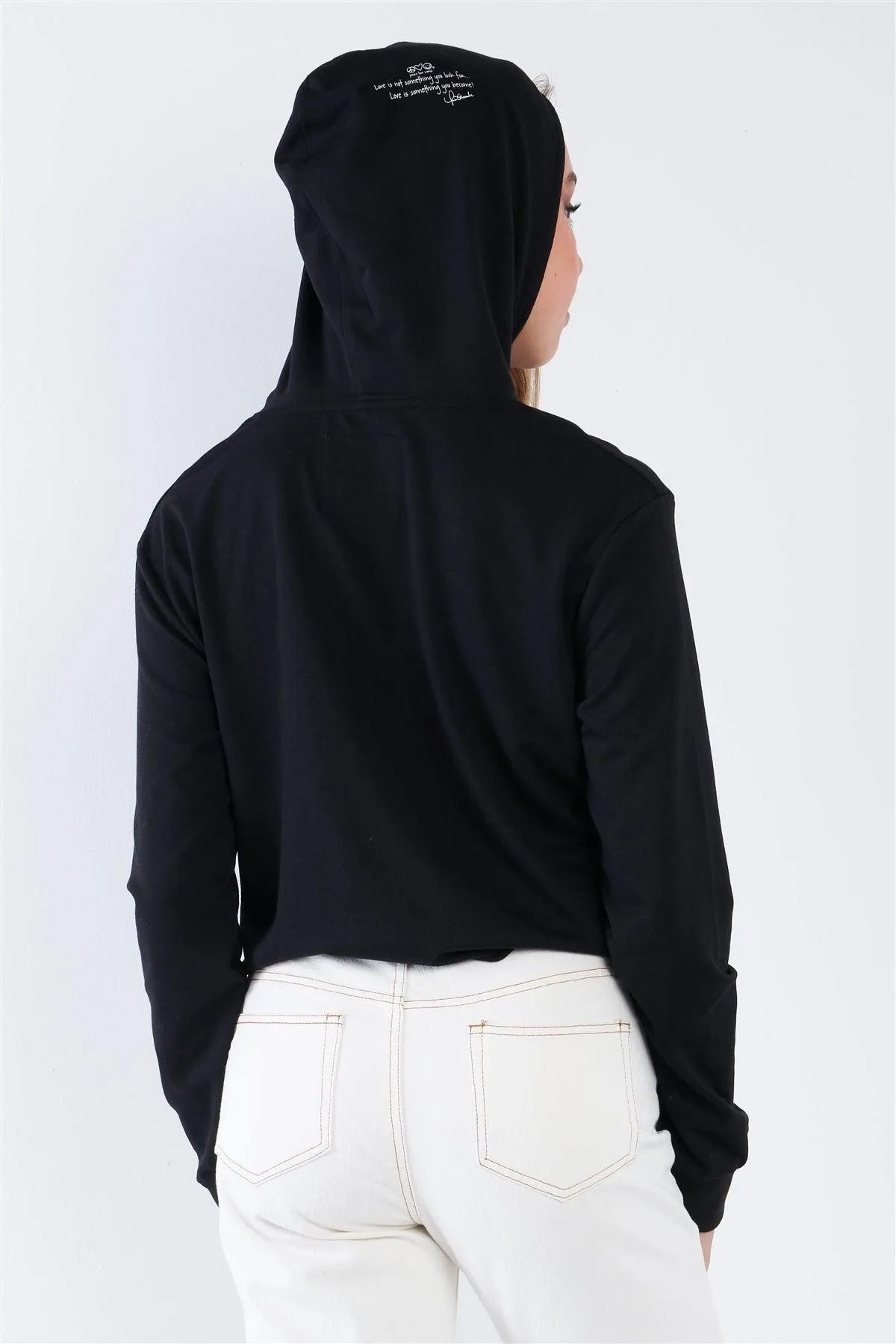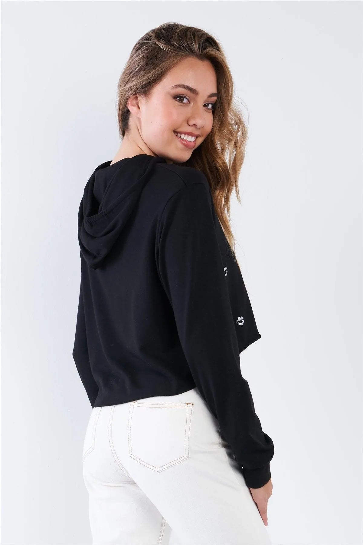 🖤 Item Features: Solid black, long sleeve, cropped hoodie, attached hood with drawstring, metallic lip graphic details, knit construction, unlined, stretchy, comfy, casual.