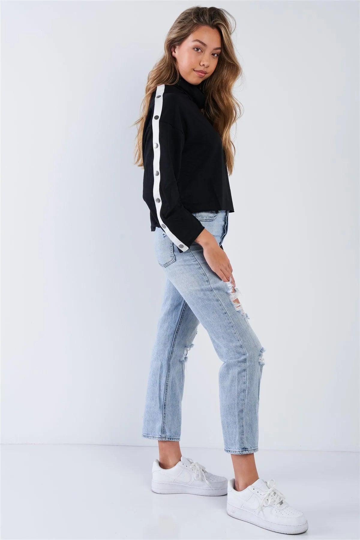🖤 Item Features: Solid black, long sleeve, turtleneck, white stripe on shoulder, snap closure at sleeve, unlined, stretchy, comfy, casual.