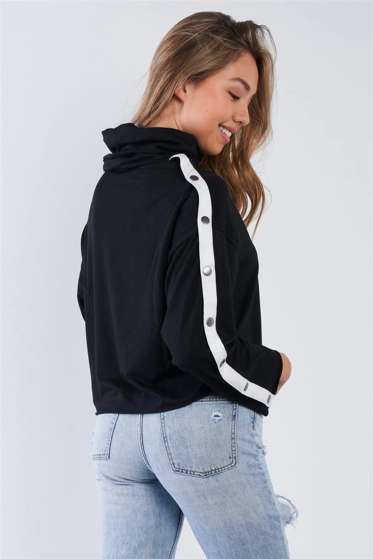 Top Features: Solid black, long sleeve, turtleneck, white stripe on shoulder, snap closure at sleeve, unlined, stretchy, comfy, casualModel is 5'10" and wearing size Small (Waist: 26", Bust: 33B, Hips: 35")Item Measurements: Length: 23" Bust 60"True to size