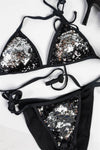 Black Mermaid Sequin Halter Triangle Top & Self-Tie Bottom Bikini Set Swimsuit