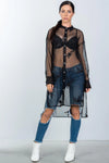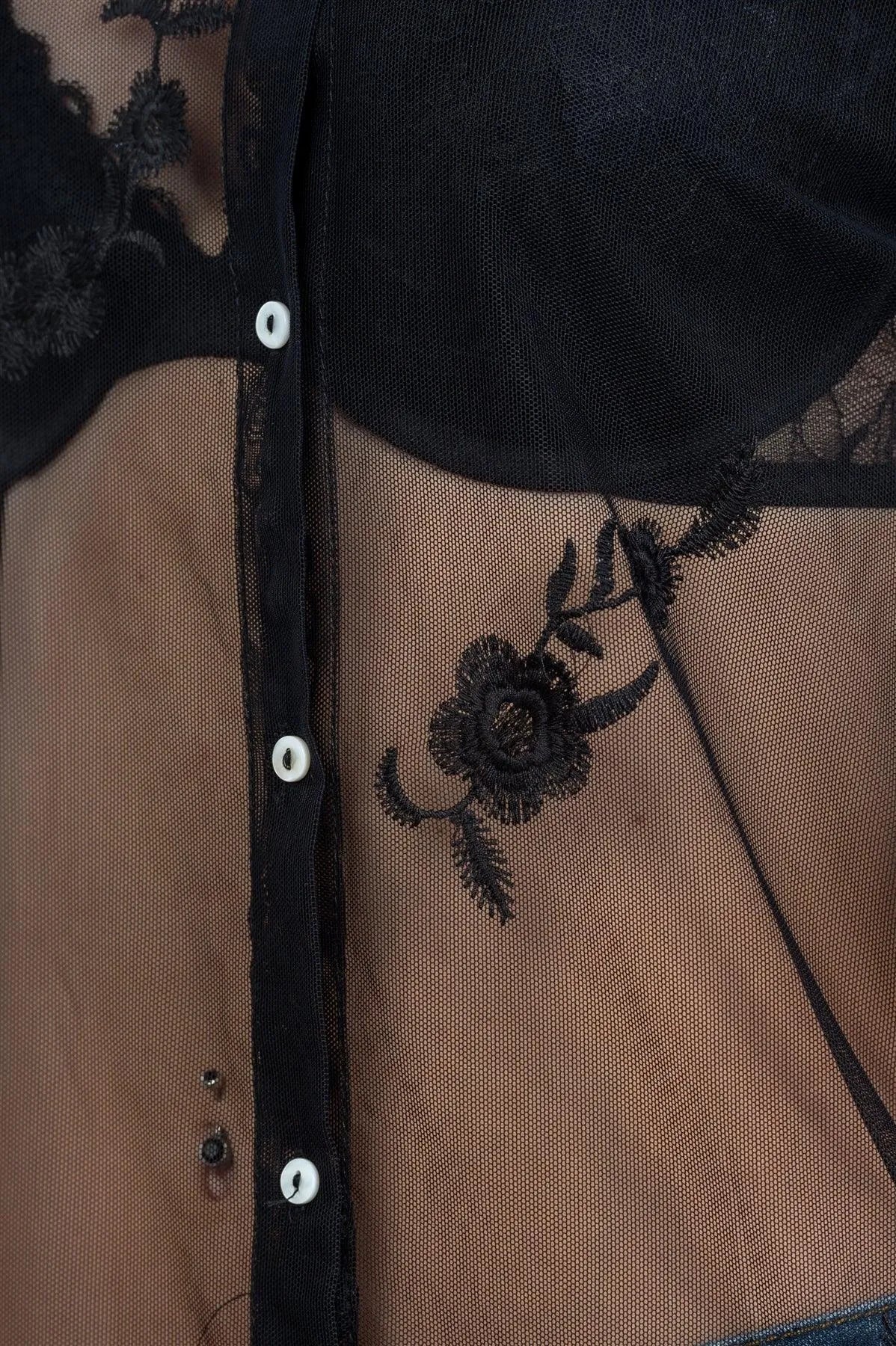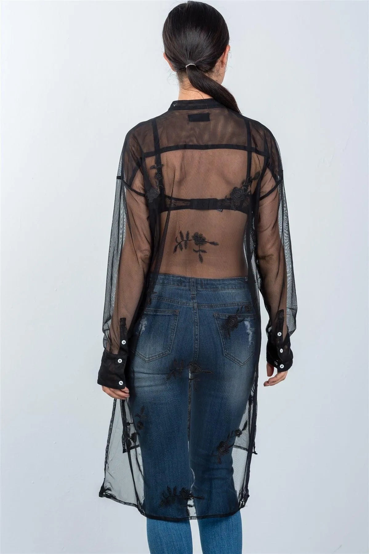 Black Mesh Sheer Floral Embroidered Button Down Boho Shirt /3-2-1