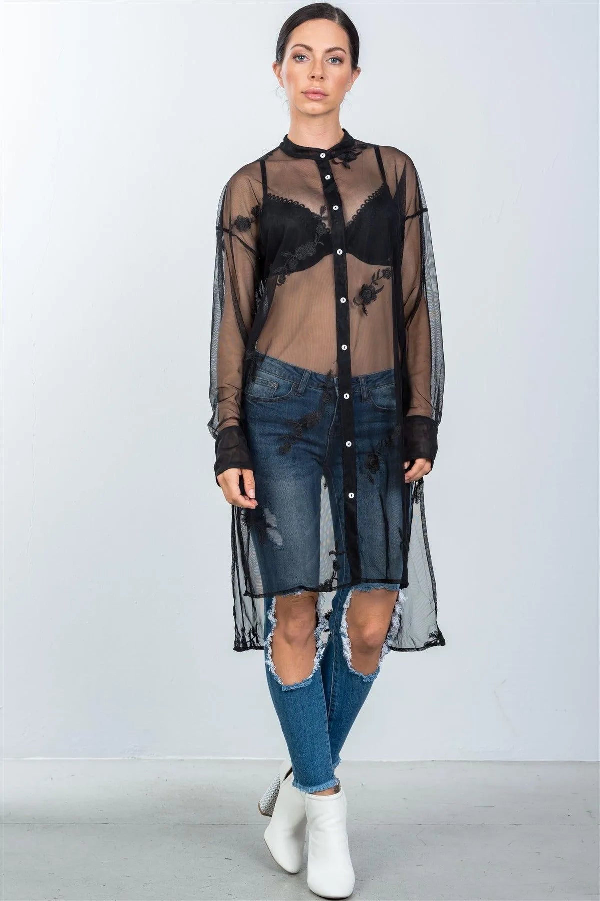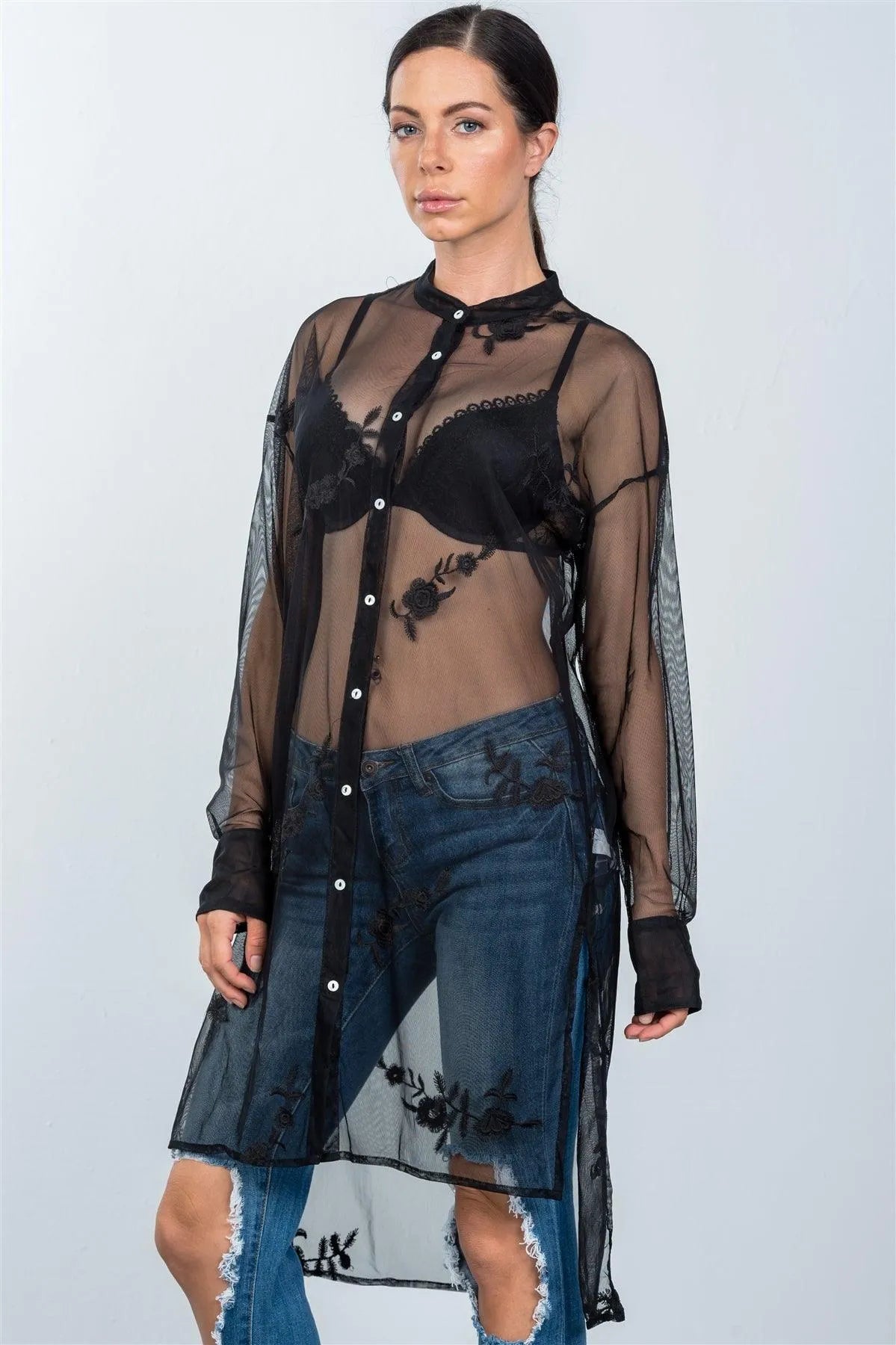 Sheer Shirt features: mesh, see through, long sleeves with button closure at cuffs, front button down closure, side split, hi-low hem, floral embroidered, relaxed fit. Undergarment not includedModel is 5'9 and wearing a Small (Waist 24", Bust 34B, Hips 37")Item Measurements: Length: 41", Bust: 39", Sleeve Length: 23"