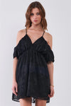 Black Mesh Floral Print Plunging V-Neck Gathered Off-The-Shoulder Flare Mini Dress /1-2-2-1