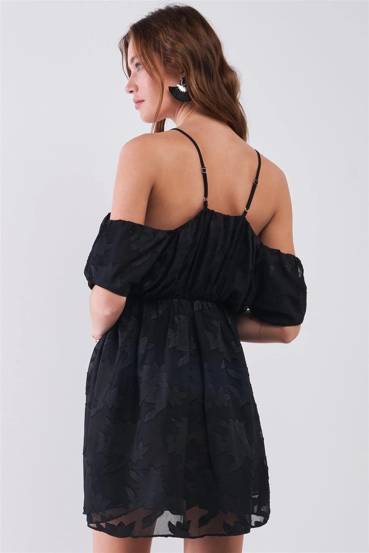 🖤 Item features: Black, solid color, floral print, mesh construction, deep V-neck, racer back, cold shoulder, mini sleeve, adjustable shoulder straps, gathered top & waist, flare bottom, lined, regular fit, non-stretch, casual chic, night out, date night, spring/summer collection